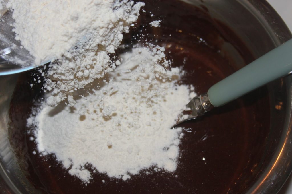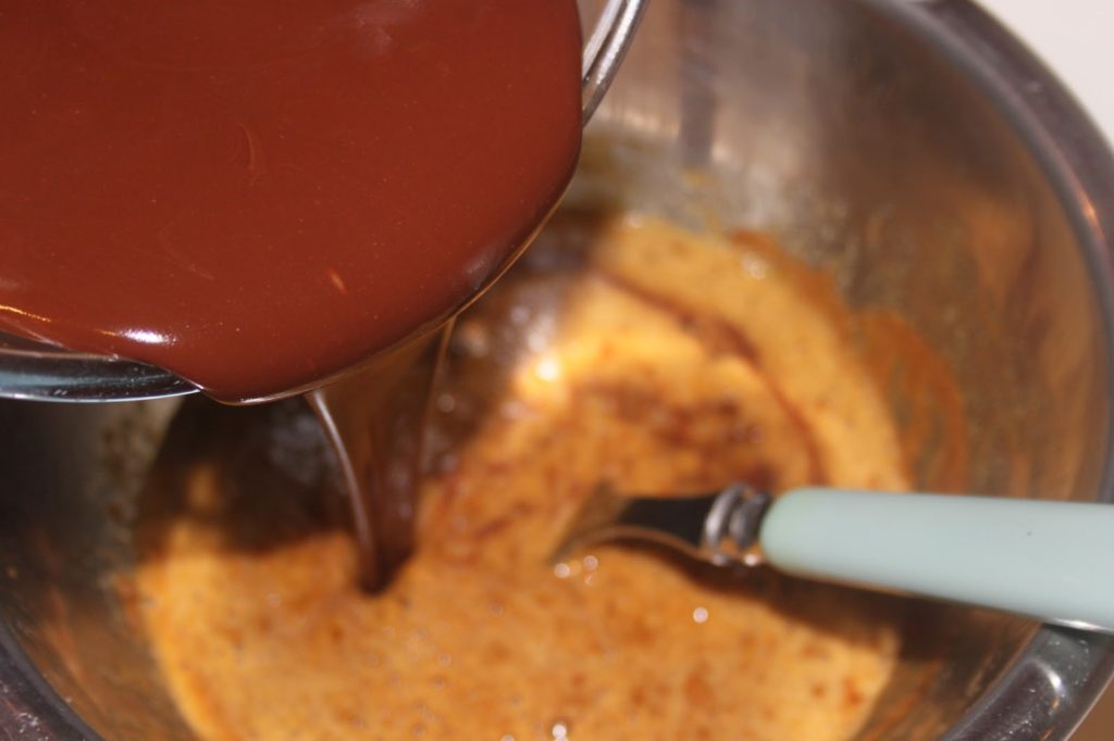 - Ne pas trop mélanger pour avoir une pâte molle et non aérée. Verser le chocolat fondu, mais pas chaud pour ne pas cuire les œufs.