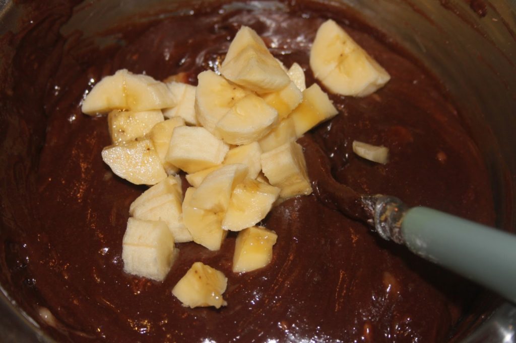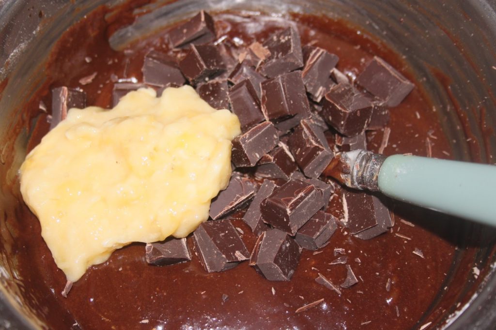 - Ajouter le chocolat coupé en morceaux et la moitié de la banane écrasée à la fourchette. Bien mélanger.