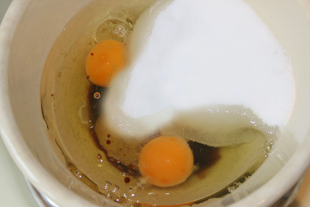 - Dans un autre bol, mélanger les deux gros œufs, le sucre et la vanille.
