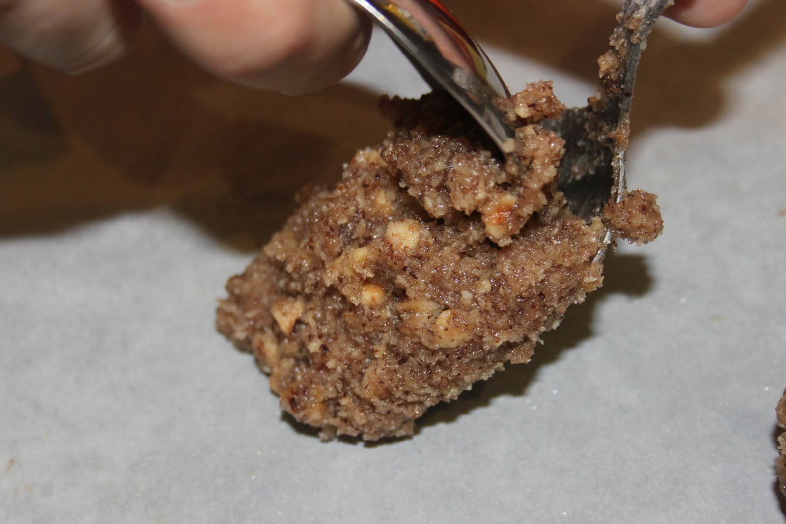 Avec deux cuillers à soupe, former des tas de pâte sur plaque à pâtisserie, garnie de papier sulfurisé.