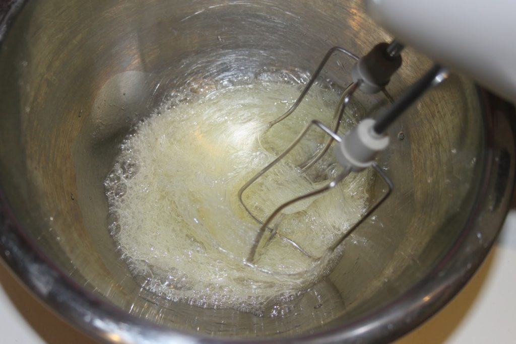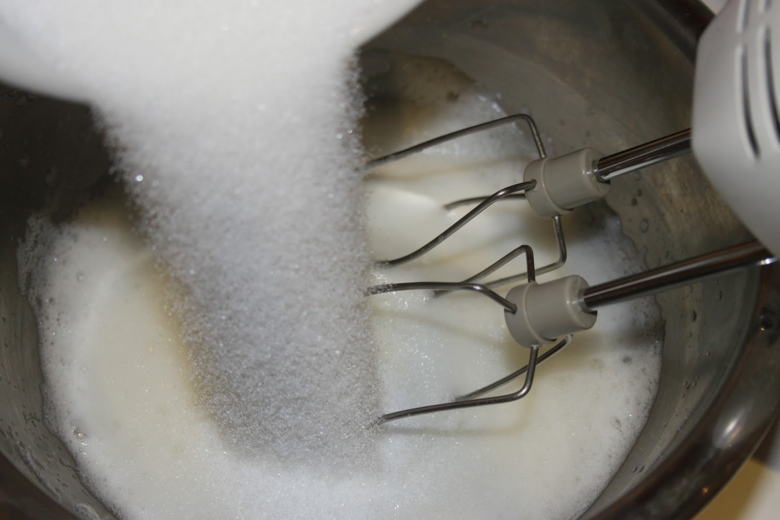 - Quand les blancs commencent à bien monter, ajouter progressivement le sucre en poudre. Continuer de fouetter jusqu’à parfaite incorporation du sucre. On obtient une sorte de meringue molle.