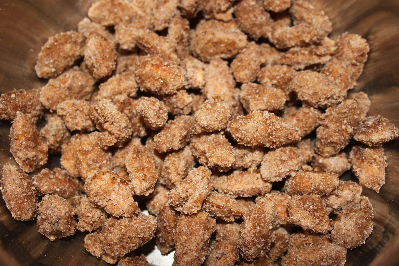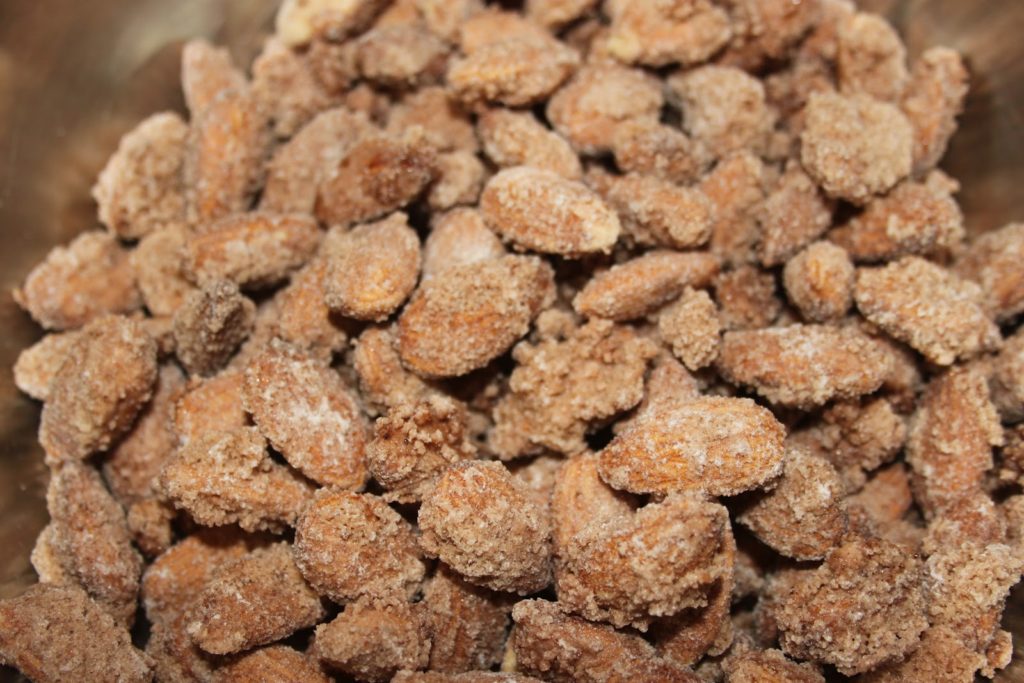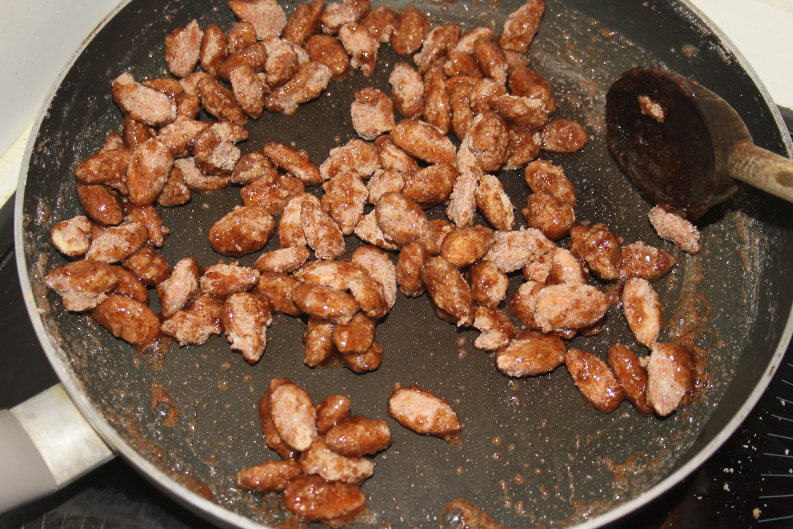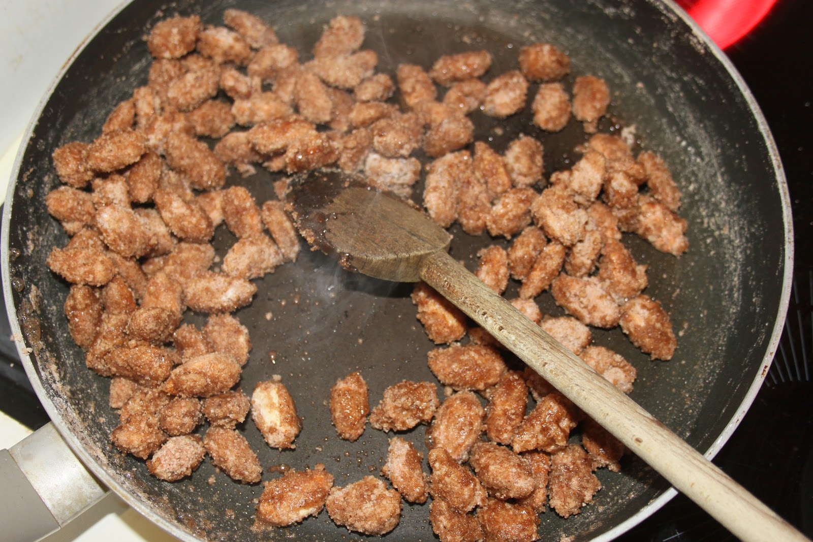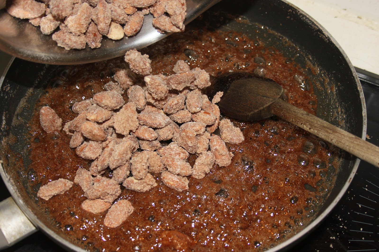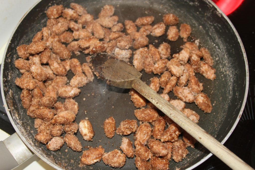 - Bien enrober de sucre toutes les amandes. Il y a donc maintenant une couche plus épaisse de sucre et c’est ce que l’on souhaite.