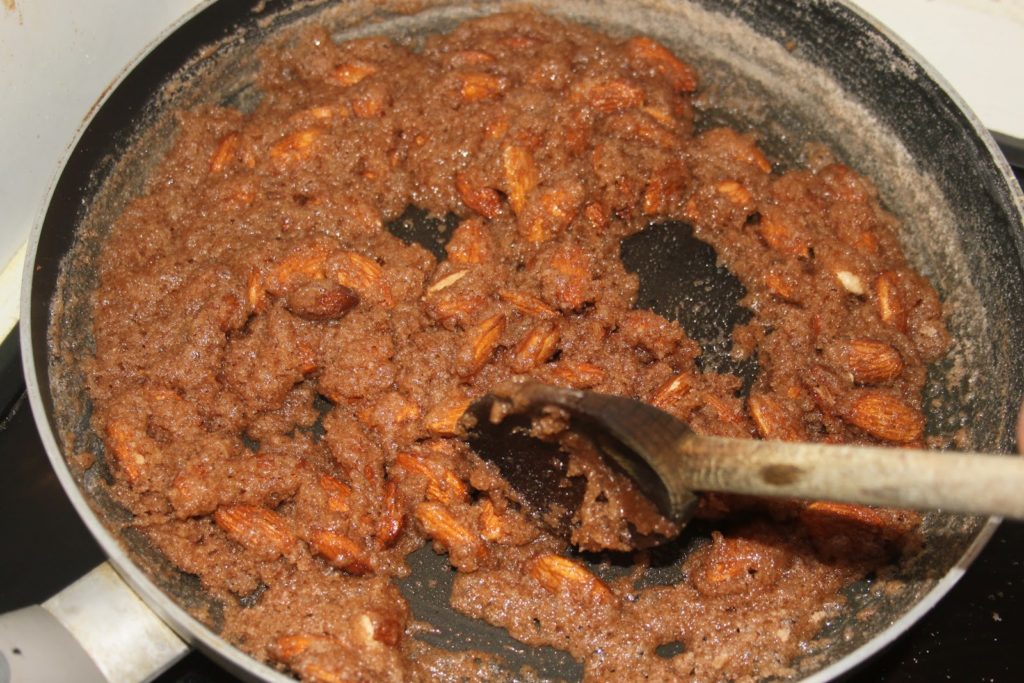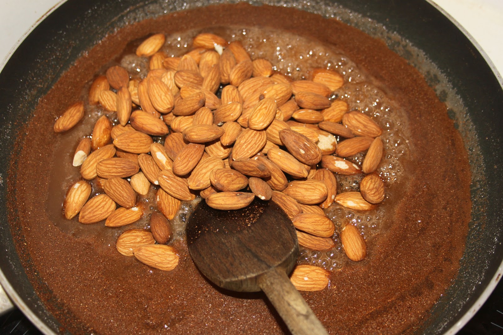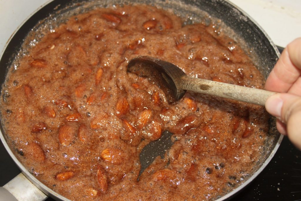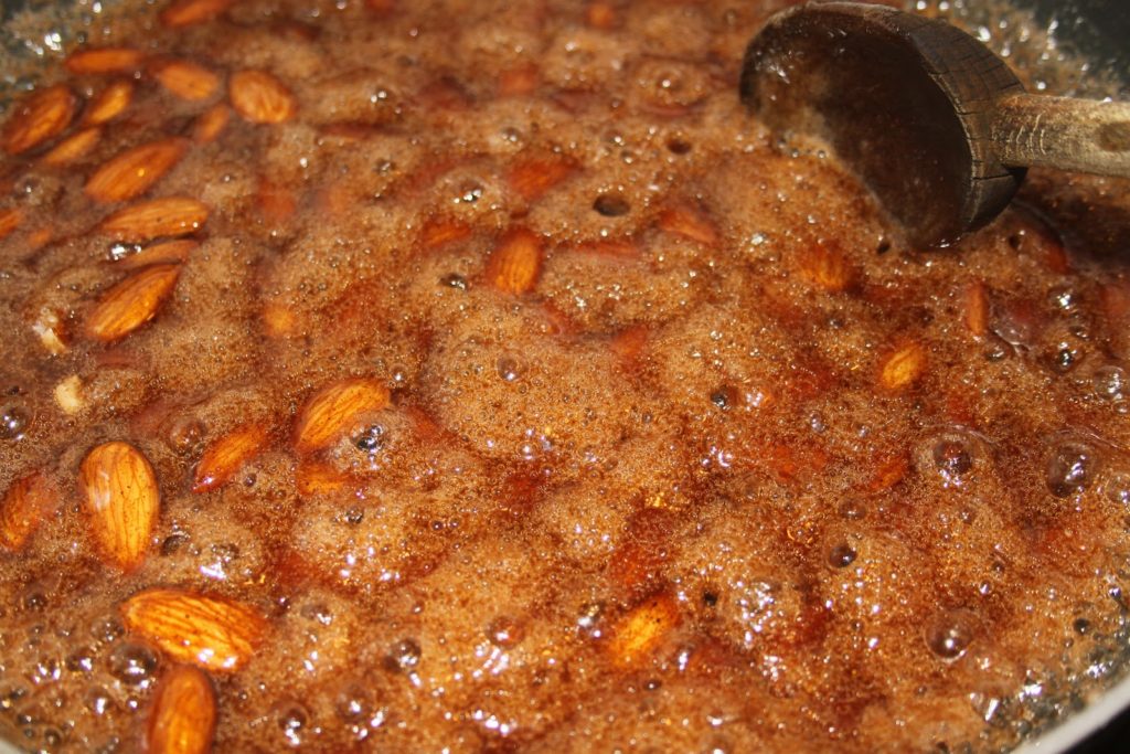 - Quand on voit que le sucre est prêt à recristalliser, ajouter les amandes.
