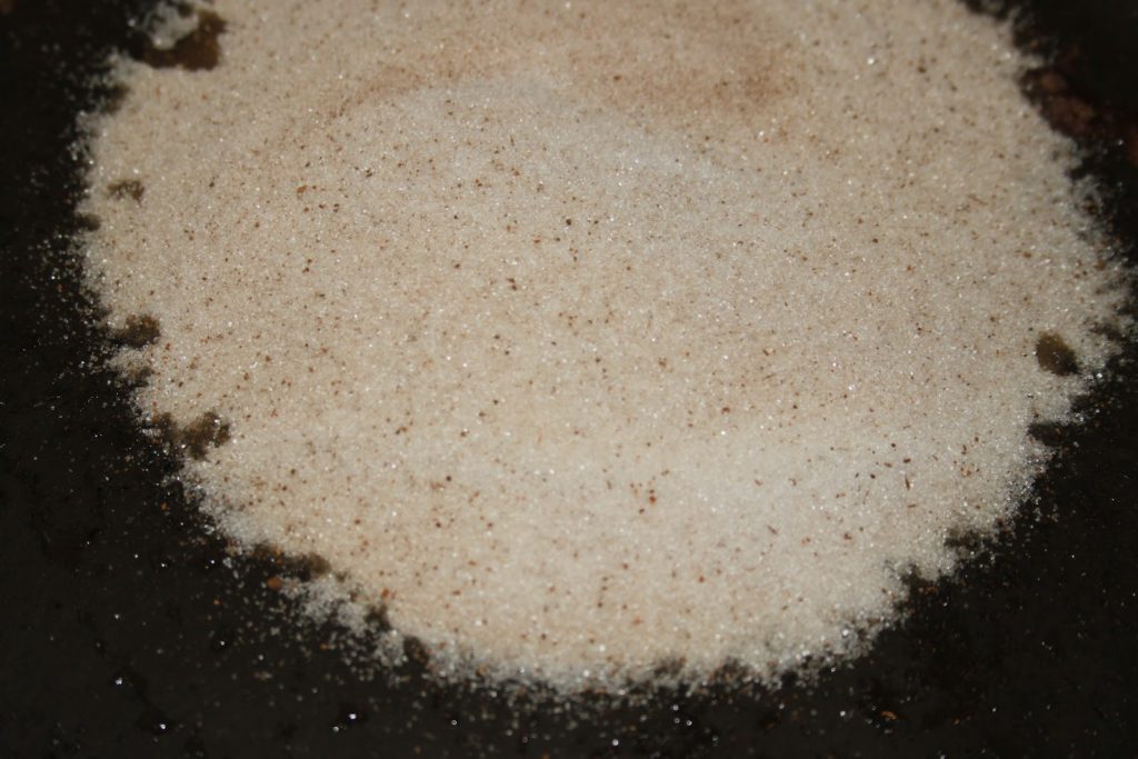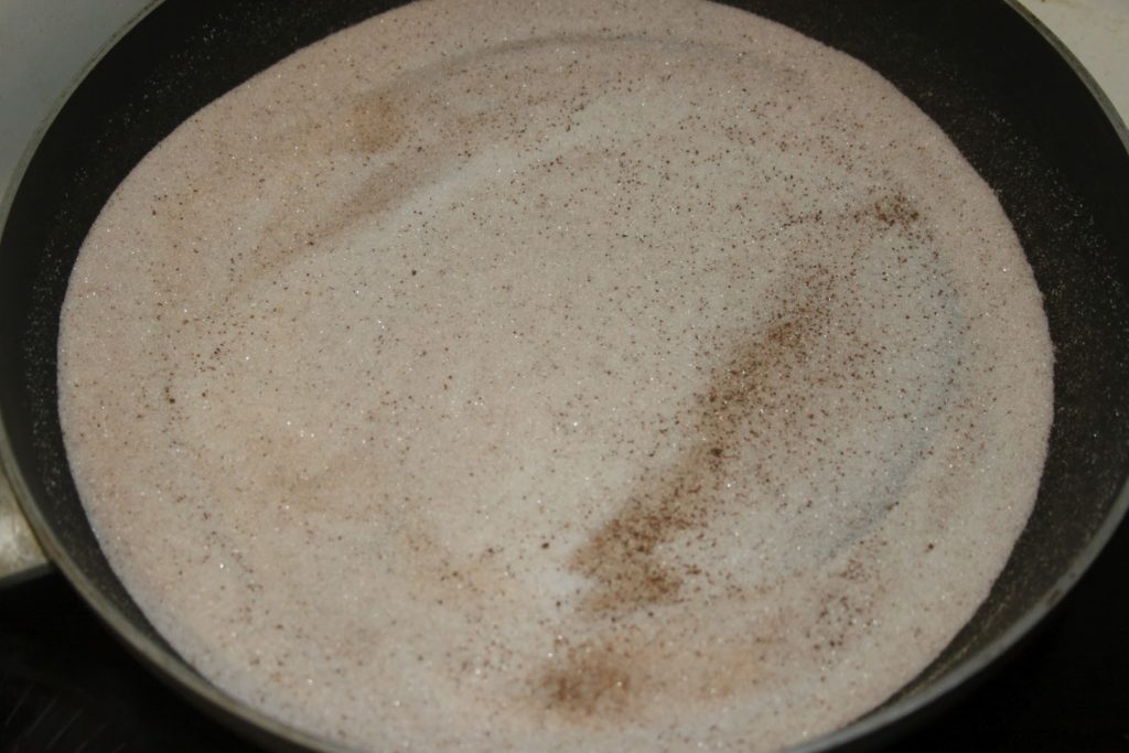 - Mettre 180 (sur les 300g) de sucre et une cuillerée à café de cannelle dans un large poêle.