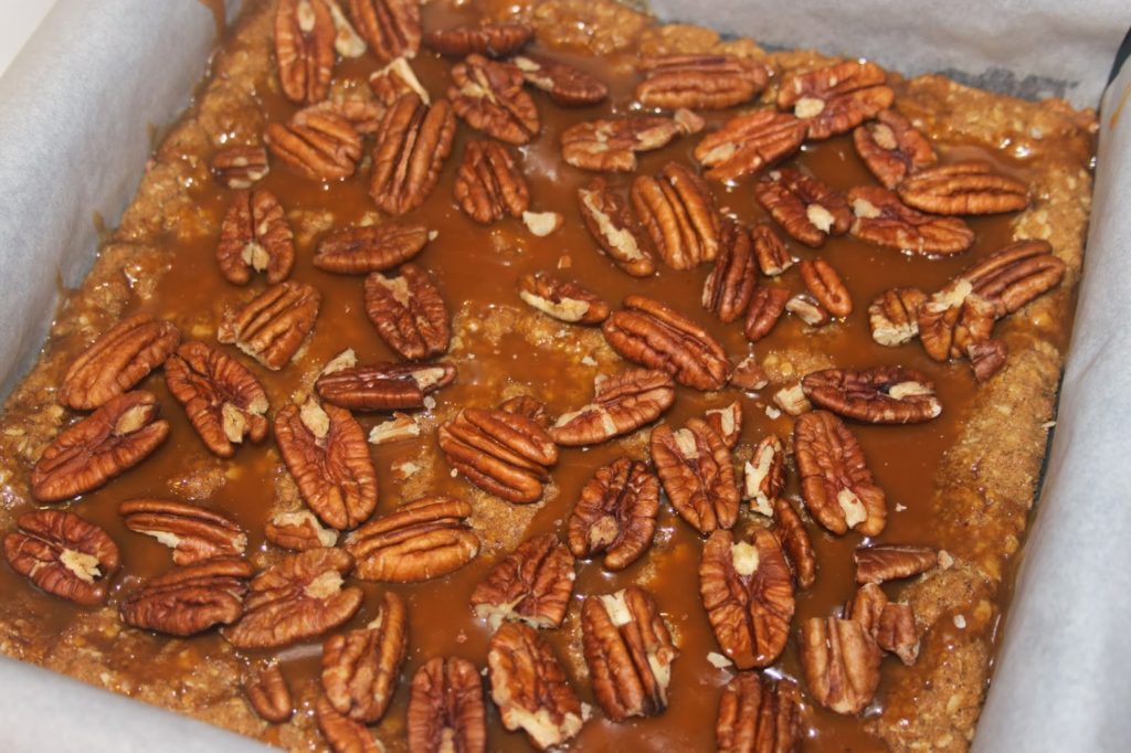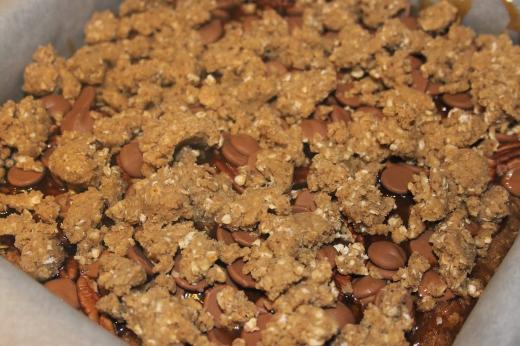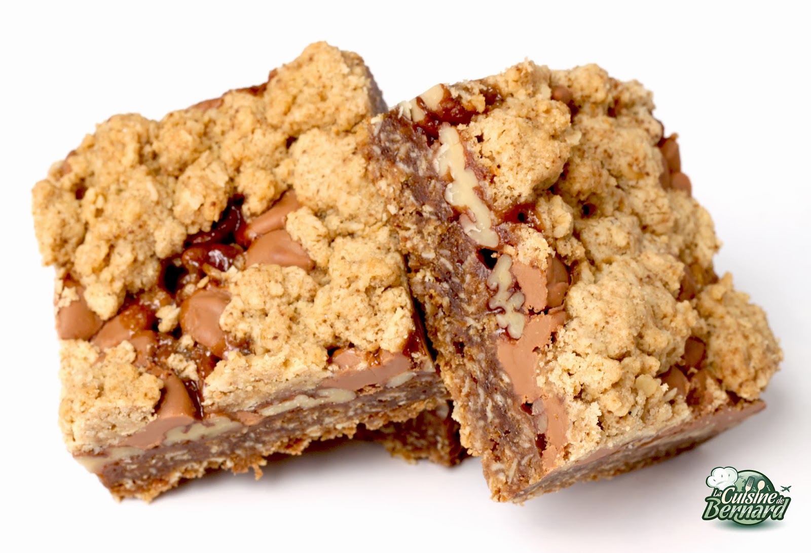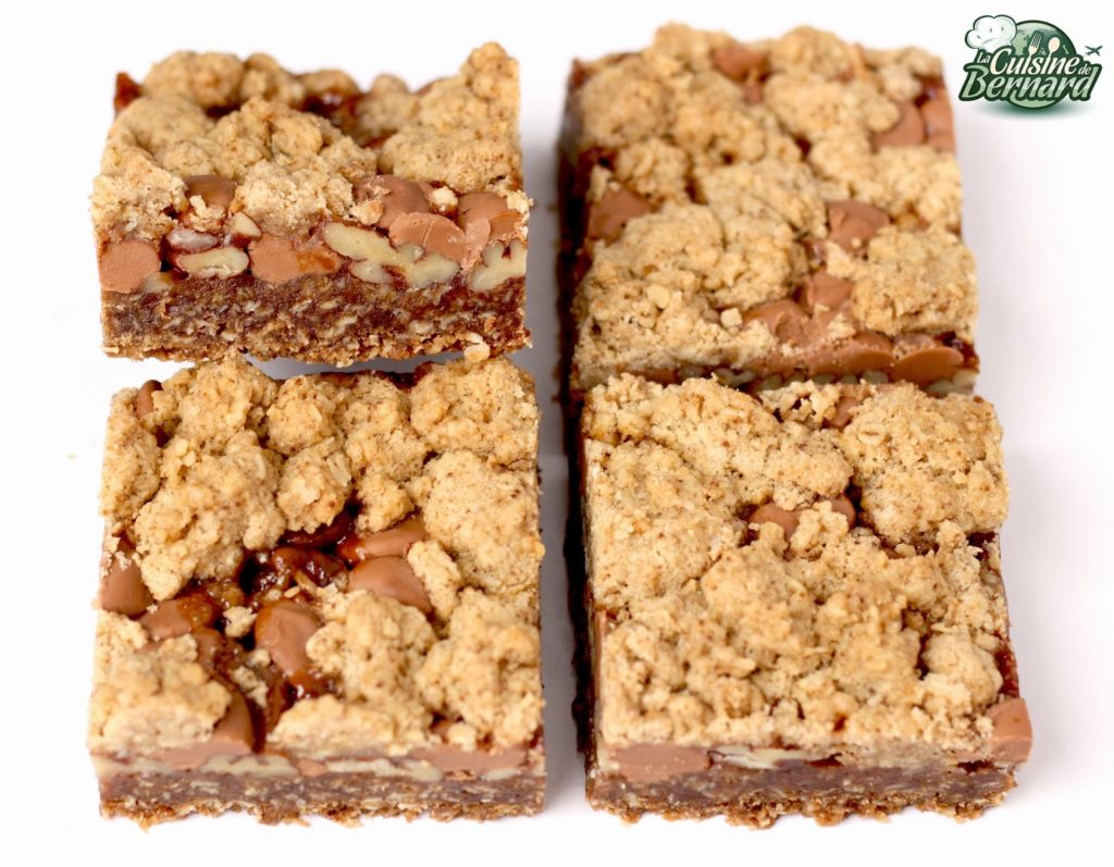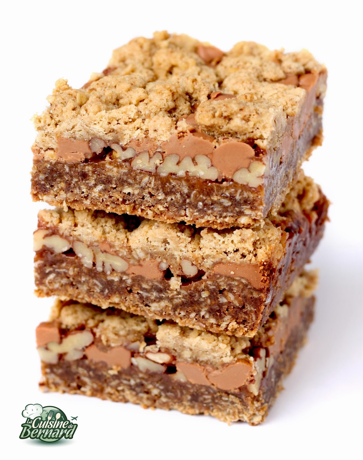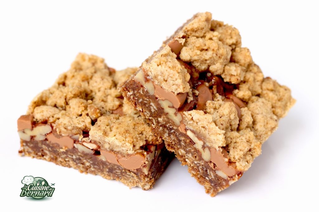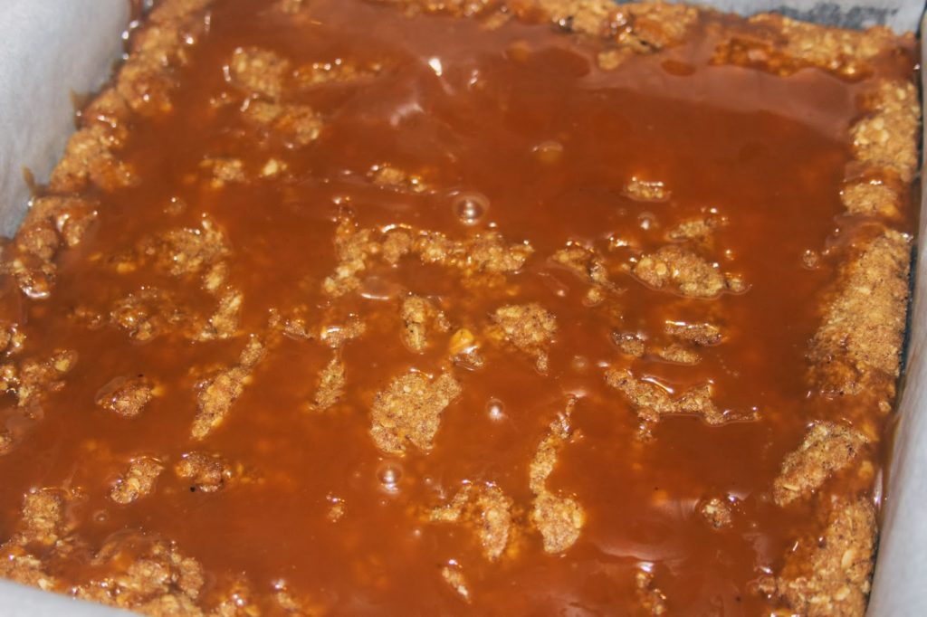 Je suis désolé. Je viens sans même m’en rendre compte d’appuyer sur le détonateur d’une bombe calorique potentiellement mortelle…! Elle est prête à exploser, fermez vite cette page avant que tout ce beurre ne vienne vous faire succomber ! Bon, c’est vrai que c’est riche, mais ce n’est pas de ma faute si il commence à faire froid !! J’avais mangé ces « caramelita bars » aux USA, pour la première fois à San Francisco. J’ai toujours gardé en mémoire un souvenir ému de ces petites choses. Voici donc le moment de vous donner ma version des faits: une pâte aux flocons d’avoine, tendre et moelleuse, surmontée de caramel, de noix de pécan, de chocolat, le tout recouvert de pâte croustillante aux flocons d’avoine. Une bombe. Je vous aurais prévenus !