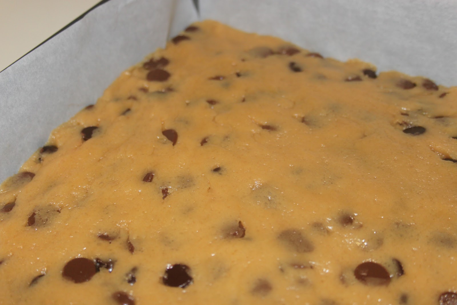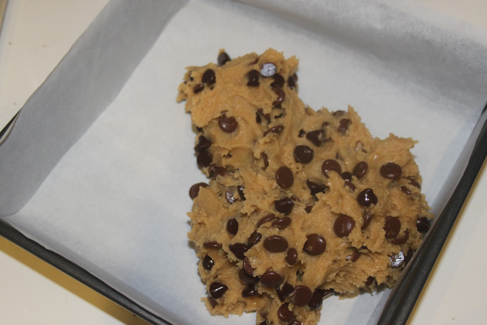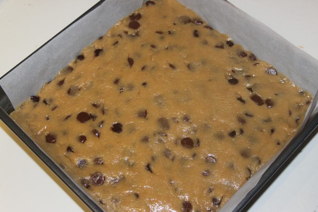 Remplir un moule de 30X30cm de papier sulfurisé (une fois dans un sens et une fois dans l’autre) puis ajouter la pâte. Sur la photo ci dessous, il s’agit d’un moule de 20X20, j’ai donc mis moins de pâte dans le moule et fait cuire le reste en boules, comme des cookies classiques.