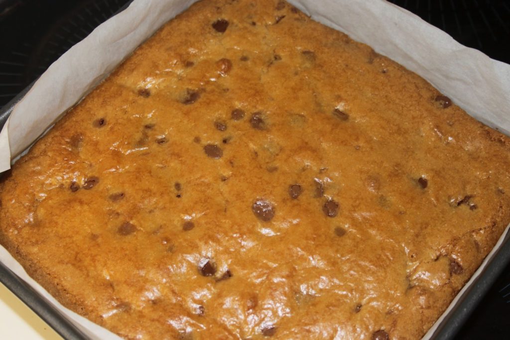 Encore une recette de cookies Bernard?? Oui, je l’avoue, j’ai ma phase régressive, mais je ne peux résister devant ces petits gâteaux. Promis, c’est la dernière recette de cookies avant un petit moment (sauf cas de force majeure!). Ces « choc chip bars », ressemblent plus à des « blondies », ces brownies sans chocolat. La pâte, au lieu d’être cuite en boulettes, l’est dans un plat, puis est coupée en parts. Bien sûr, on peut en faire des cookies classiques, mais cuite dans le plat, elle s’adressera aux amoureux de pâte pas trop cuite. Je conserve précieusement cette recette depuis 20 ans, depuis qu’une famille américaine chez qui je restais pour un séjour linguistique, me l’avait donnée. Gardez-la dans un coin, car ces « choc chip bars » vont vous régaler!