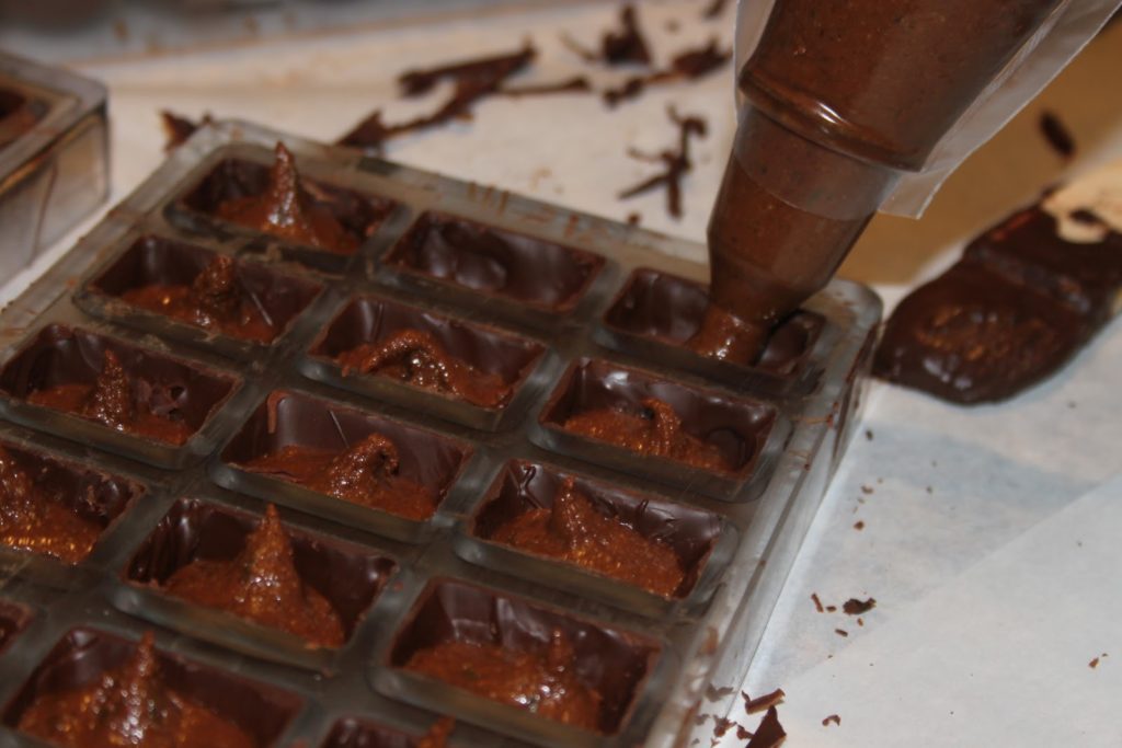 - Bien mélanger puis mettre le praliné dans un poche munie d’une douille de 8mm. Remplir les cavités de chocolat tempéré, avec le praliné au citron vert. Mettre au frais le temps que le praliné durcisse un peu. Puis refermer en complétant avec du chocolat tempéré.