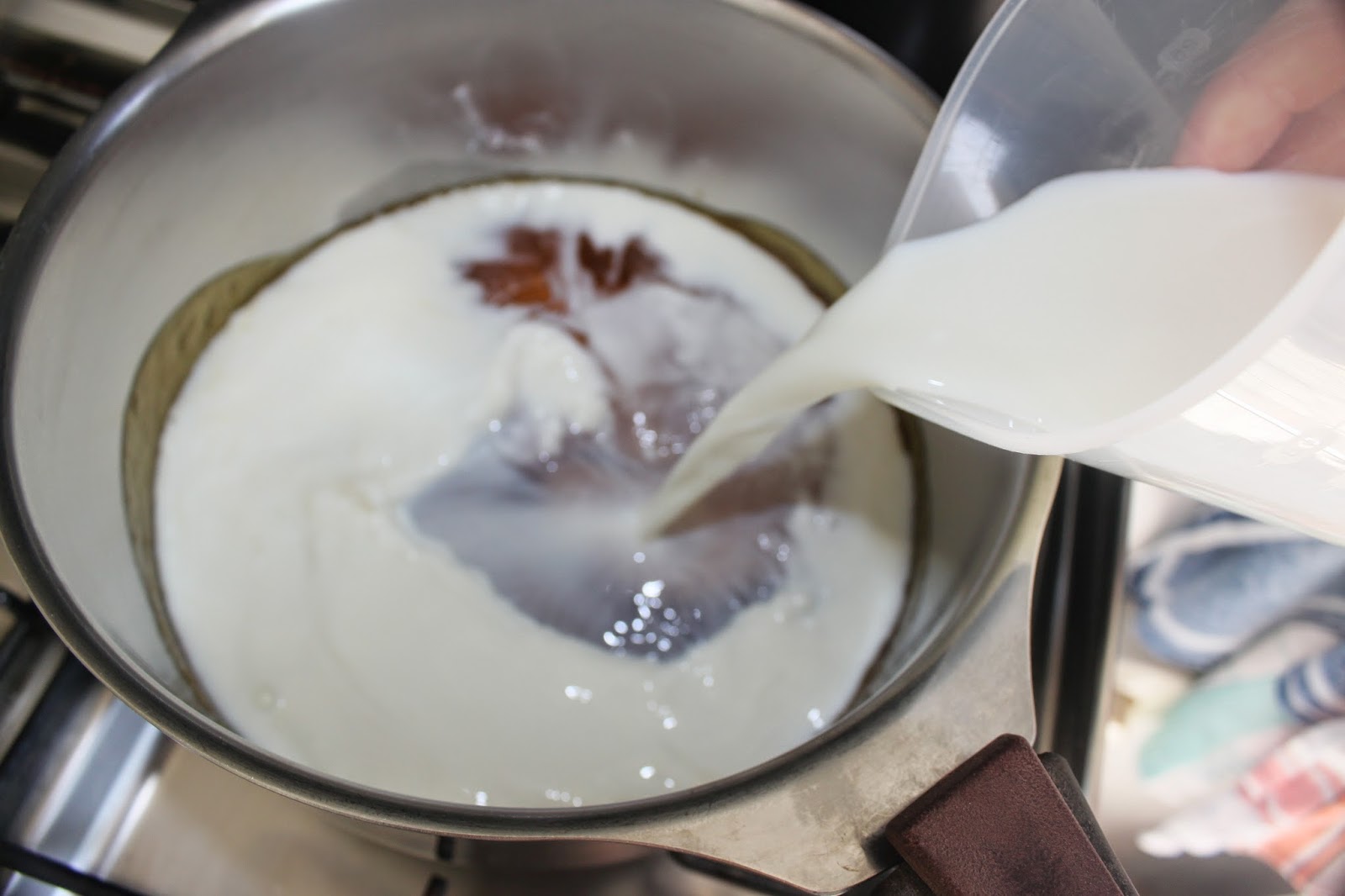 Hors du feu, ajoutez le lait en petite quantité. Faites bien attention aux projections éventuelles !