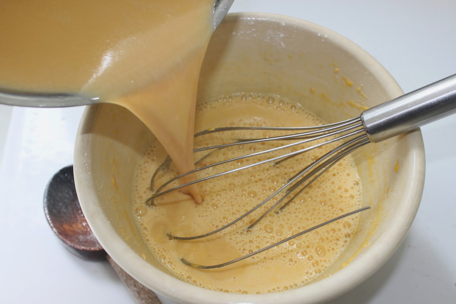 Quand tout le caramel a eu le temps de fondre, portez à frémissement le lait puis versez tout en fouettant sur les jaunes/sucre/poudre à crème.