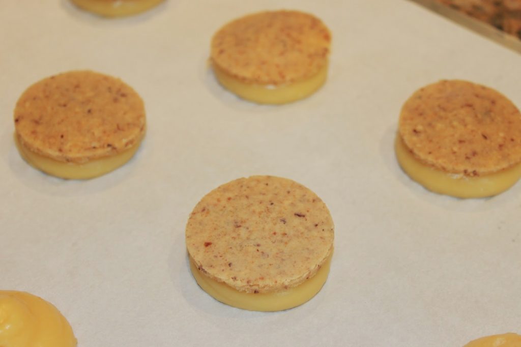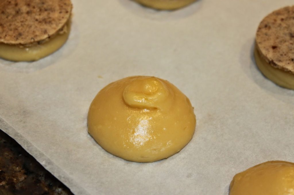 Posez délicatement un disque de pâte pile au centre du chou. Le disque doit rester bien en équilibre, de cette façon la pâte recouvrira parfaitement les choux.
