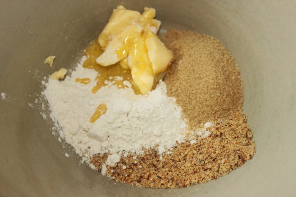 Commencez par préparer la pâte noisettes en mélangeant ensemble la poudre de noisettes grillées (si elles ne sont pas grillées, ça marche aussi !) la cassonade, la farine et le beurre demi-sel mou.