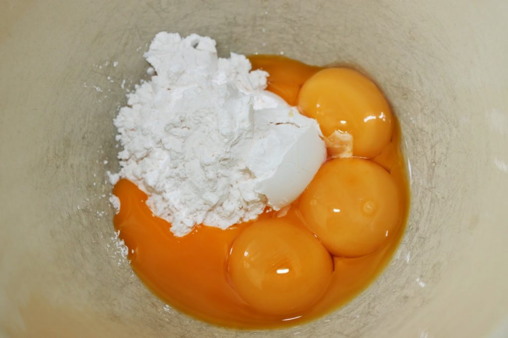 Pendant ce temps, fouettez les jaunes avec la poudre à crème (ou la maïzena) et le sucre (les 25g).