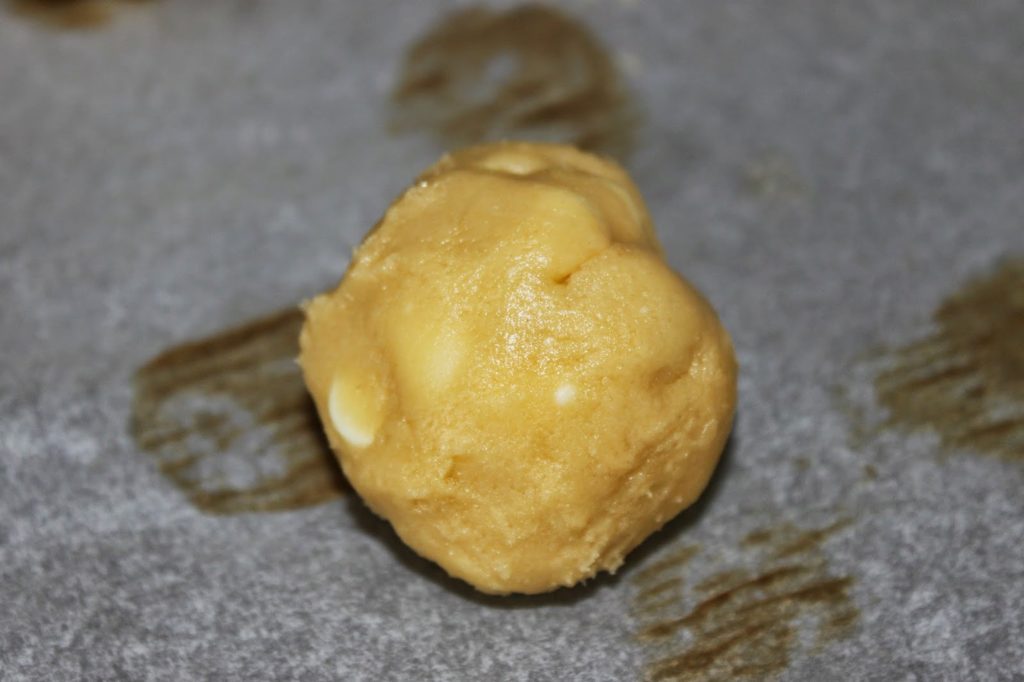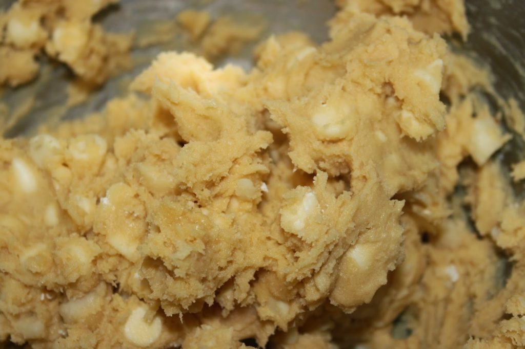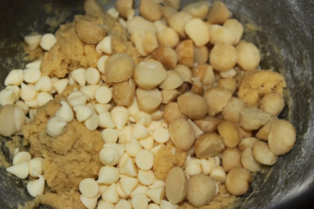- Mettez les pépites de chocolat blanc et les noix de macadamia dans la pâte.