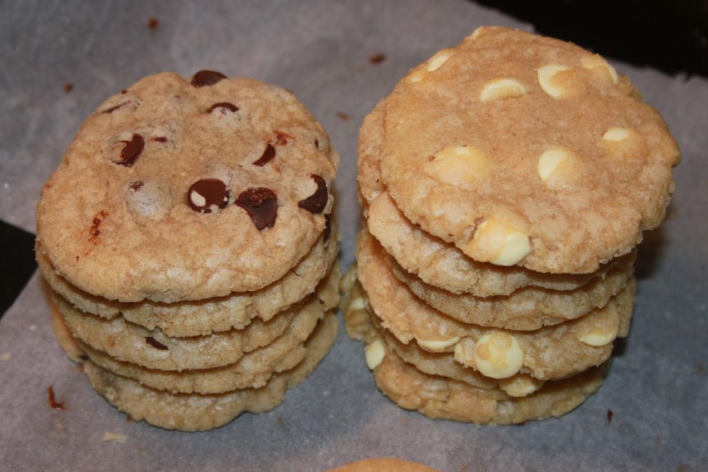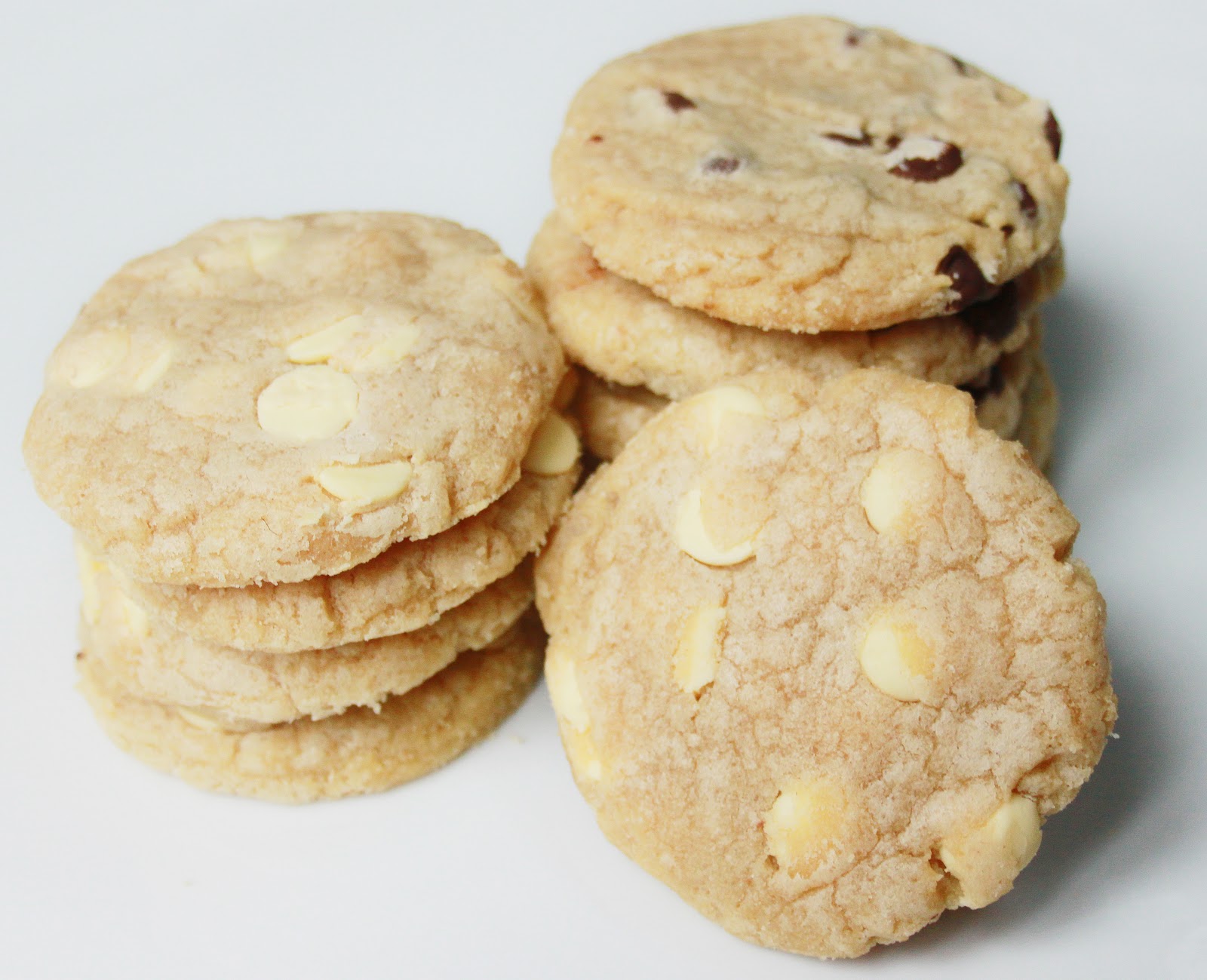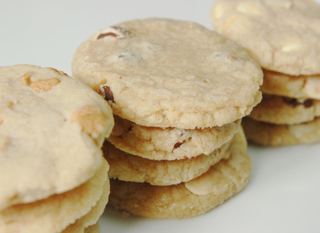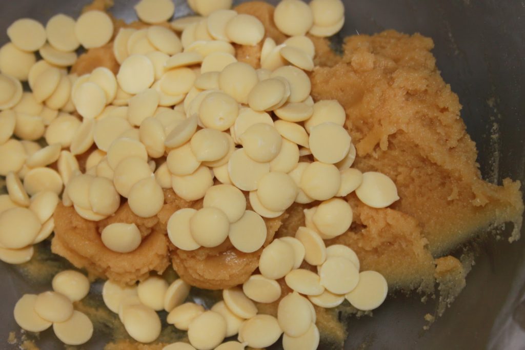 La recette que je vais vous proposer n’est pas forcément la même au gramme près que celle de Laura Todd, mais disons que vous aurez des clones quasi-parfaits. Je n’ai pas de laboratoire alimentaire top secret, mais je teste énormément, je note le résultat, je recalcule pour corriger une fonte trop rapide, une friabilité trop prononcée… Je procède comme cela depuis que j’ai peut être 12 ans (avec le kouign aman!). En regardant un cookie au chocolat blanc Laura Todd, que voit-on? Un cookie plat (pas de levure), pas beaucoup d’oeuf, des grains de sucre très fins (exit la cassonade mentionnée dans la recette « authentique ») et surtout une matière grasse figée. Ah bon?? Figée? C’est à dire? Cela veut dire que ce n’est pas du beurre qui suinterait du cookie. Ils sont certes très gras, mais paradoxalement ils ne laissent pas trop de traces de gras sur les doigts, beaucoup moins que l’essai au beurrer;ie! J’ai donc pensé à la margarine et là le résultat était presque parfait avec un mélange beurre+margarine. Mais il manquait toujours quelque chose. En regardant de plus près le cookie acheté, on observe un aspect presque ciré. Et là, j’ai pensé à ce qui donnait cette apparence et que l’on pouvait trouver aux USA dans les années 30 (date supposée de la création de la recette par la vraie Laura Todd!): de la graisse de noix de coco hydrogénée, autrement connue sour le nom de Végétaline chez nous! Cette graisse a été inventée dans les années 20 et est très courante dans la pâtisserie américaine (en fait ils utilisent du « shortening »qui regroupe plusieurs graisses, dont celle de noix de coco). Les cookies Laura Todd sont assez fermes (bien que sous-cuits) à température ambiante, bien plus que tous mes essais réalisés jusqu’alors. Et cela donne l’aspect ciré que l’on trouve sur les célèbres cookies. N’essayez pas la recette avec uniquement du beurre, cela donnera des cookies écoeurants. Pourtant je suis un fan inconditionnel du beurre frais! Mais parfois, il faut savoir le mettre de côté, comme dans mes « Flapjacks » ou dans les futurs « Pastéis de Nata ». Concernant le sucre, ils parlent de sucre cassonade dans la recette « authentique ». Mais non, cela est impossible. Les grains sont trop gros, et le cookie devient croustillant. Il s’agit très probablement d’un mélange de sucre semoule blanc et de ce que l’on appelle chez nous (en France) vergeoise blonde.