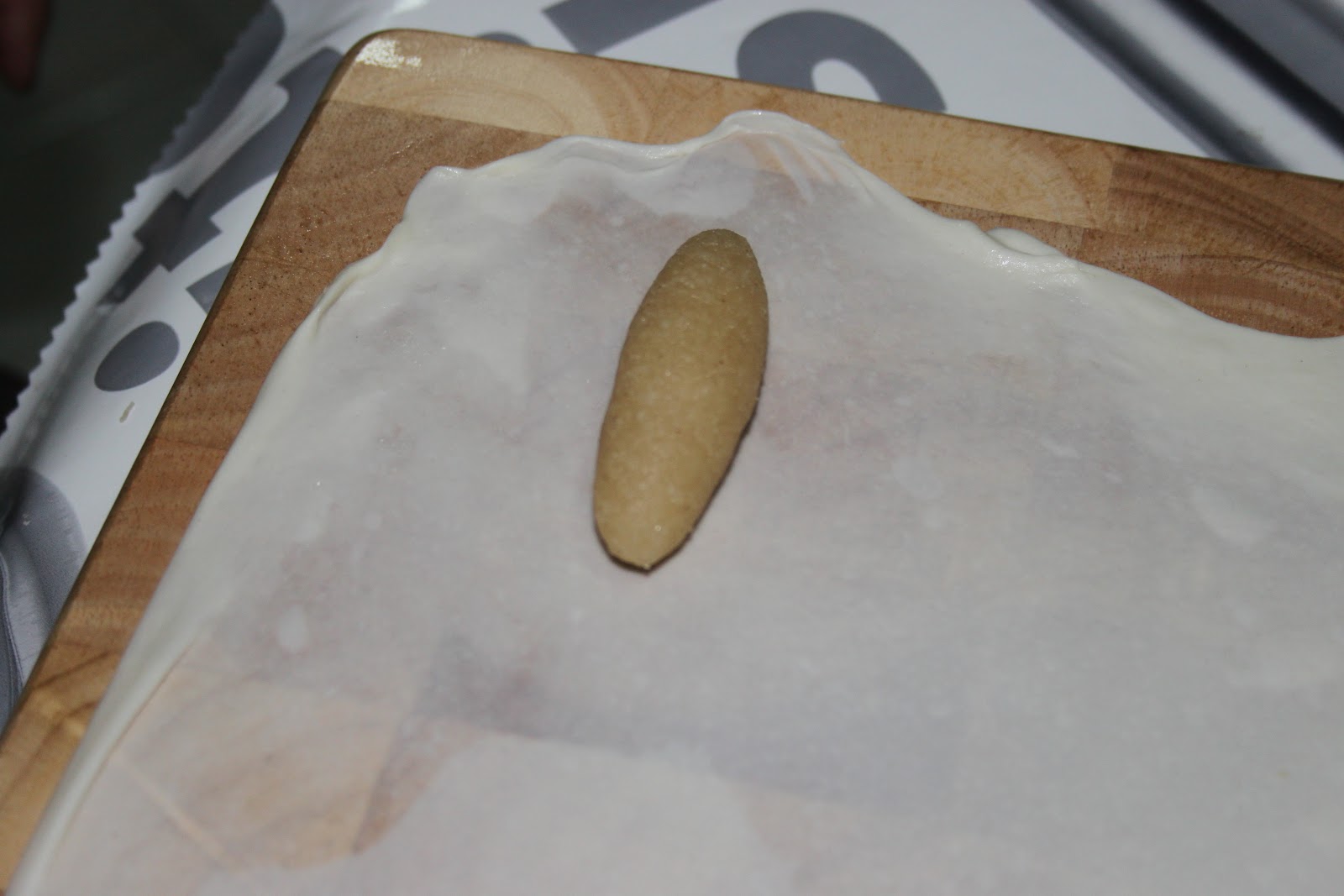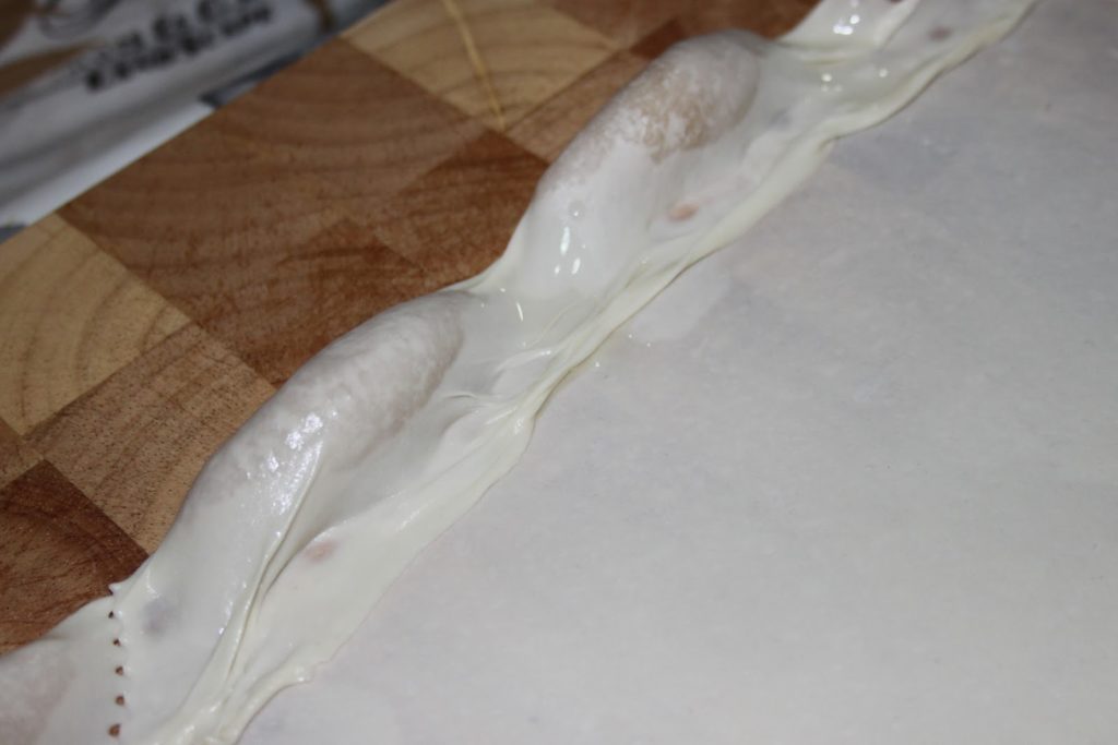 - Poser ensuite deux ou trois boudins de farce sur la pâte dans la longueur.