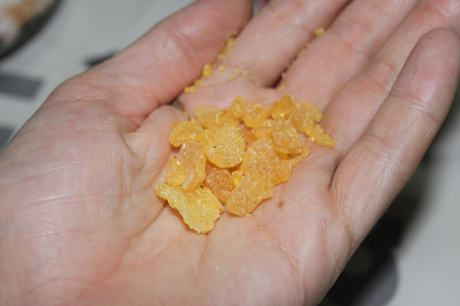 - Voici la gomme arabique. Sur la photo, il y en a beaucoup trop! Il suffit de prendre quelques cristaux. En gros, cela correspond à une bonne pincée.