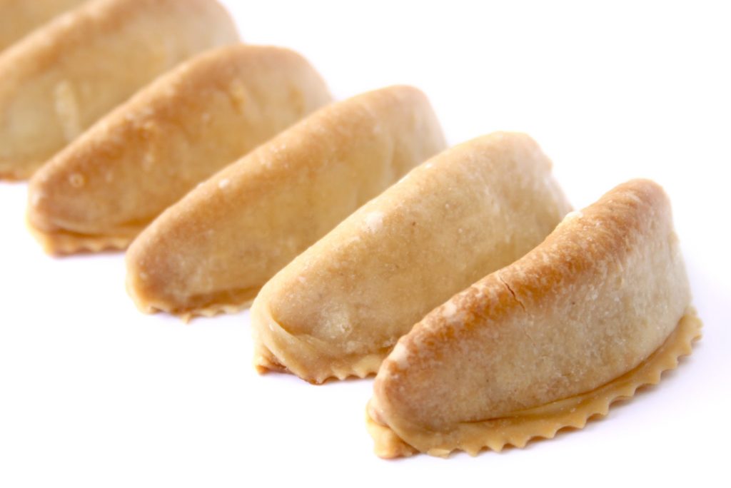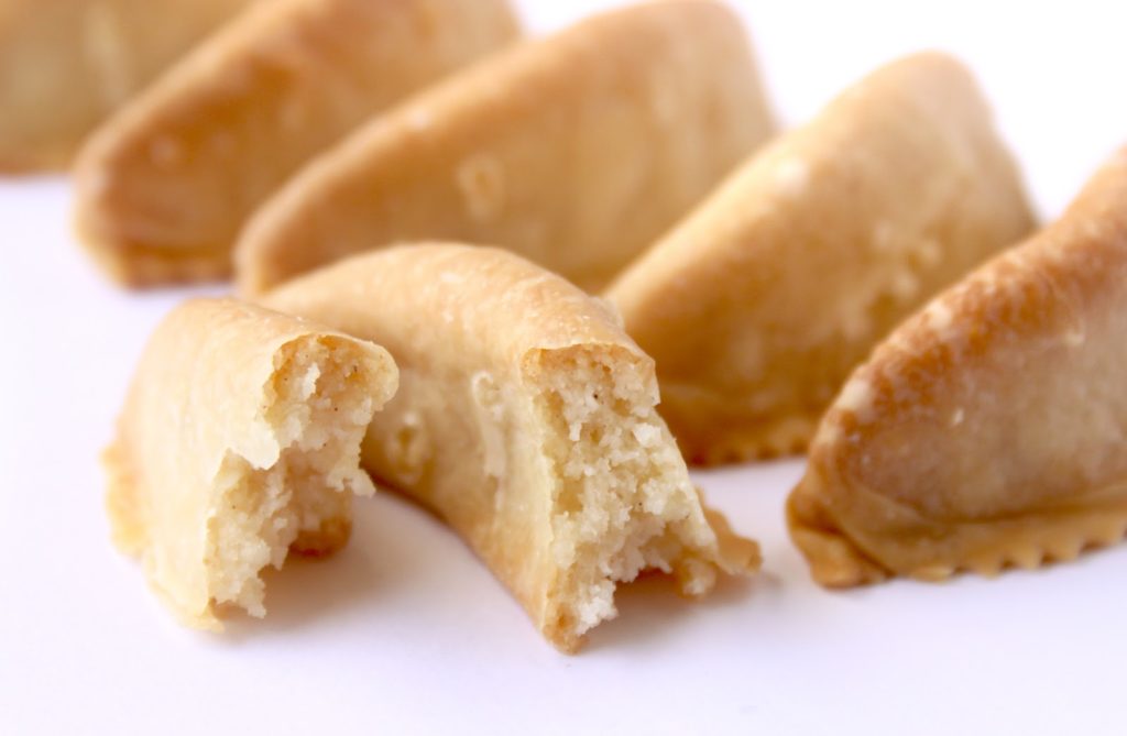 - Laisser ensuite « croûter » ou sécher pendant… 24 heures!! C’est une étape très importante pour obtenir des cornes de gazelles avec une fine couche craquante.Le jour de la cuisson: percer avec une aiguille trois petits trous sur le haut des cornes, cela va éviter la formation d’une bulle d’air qui éclaterait au four! Cuire ensuite 15-20 minutes à 160°C. Il faut adapter en fonction de son four. Les cornes doivent être blondes mais pas trop colorées.