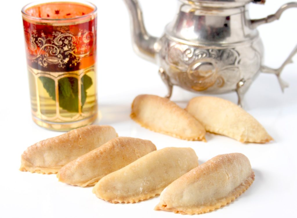 Je vous donne ici la recette telle que l’a apprise Lalla Fatima de sa grand-mère, qui elle-même l’avait apprise de sa grand mère etc… Il m’a été précisé qu’il était important d’utiliser du sucre en morceaux plutôt que du sucre en poudre. Mais surtout (et ça j’ai bien vu que c’était important), qu’il fallait soi-même monder les amandes. Le fait de les plonger dans l’eau bouillante pour les éplucher, leur confère un moelleux que l’on ne trouve jamais… Après, par souci de commodité, on préférera peut-être utiliser de la poudre d’amandes et du sucre en poudre. Mais si l’on veut la perfection de ces petites cornes de gazelles (qui s’appellent « sabots de gazelles » en arabe…), vous avez tous les éléments dans la recette ci-dessous!