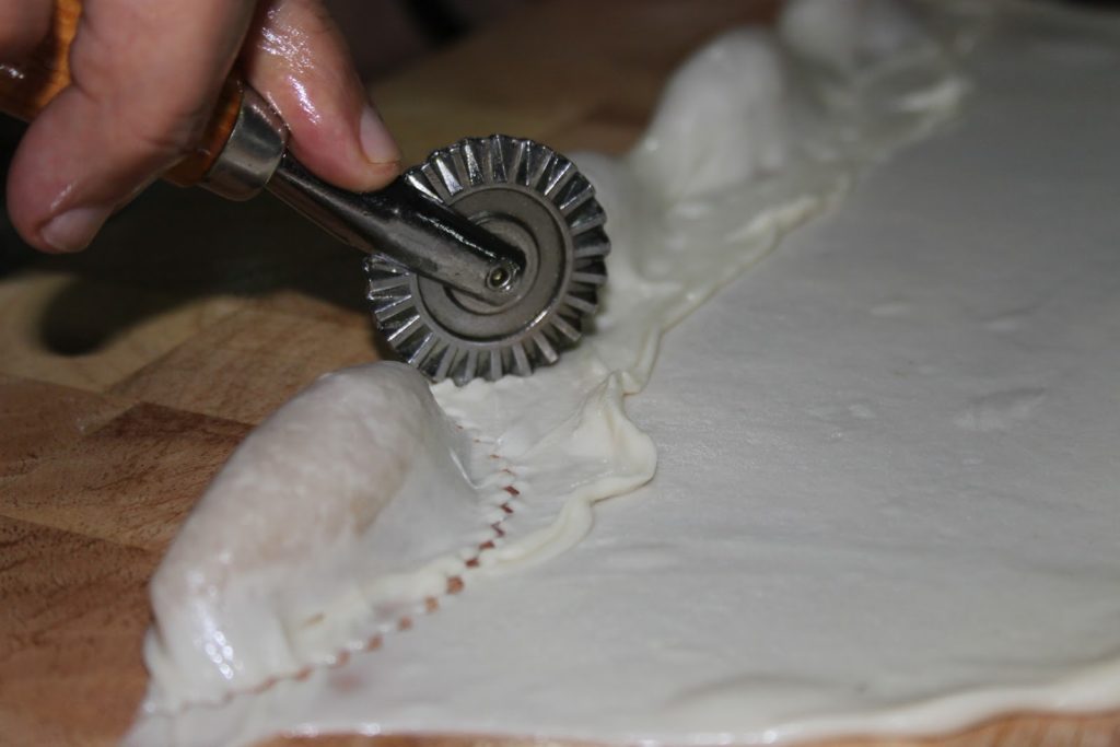 - Faire de même avec toutes les autres cornes. On a mis trois boudins sur la pâte, mais il reste plein de pâte, on peut donc continuer à faire des cornes avec le reste de pâte étalée. Il suffit d’égaliser la pâte avec la roulette puis de procéder comme expliqué ci-dessus. Mettre les cornes de gazelles sur une plaque à pâtisserie huilée ou garnie de papier sulfurisé.