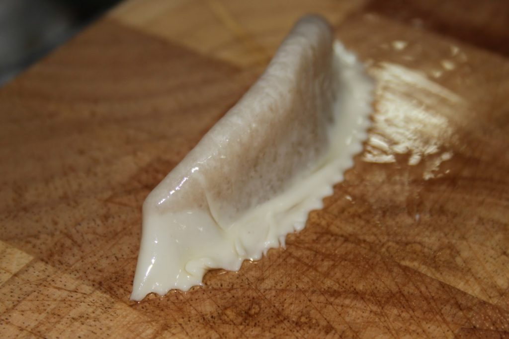 Le jour de la cuisson: percer avec une aiguille trois petits trous sur le haut des cornes, cela va éviter la formation d’une bulle d’air qui éclaterait au four!