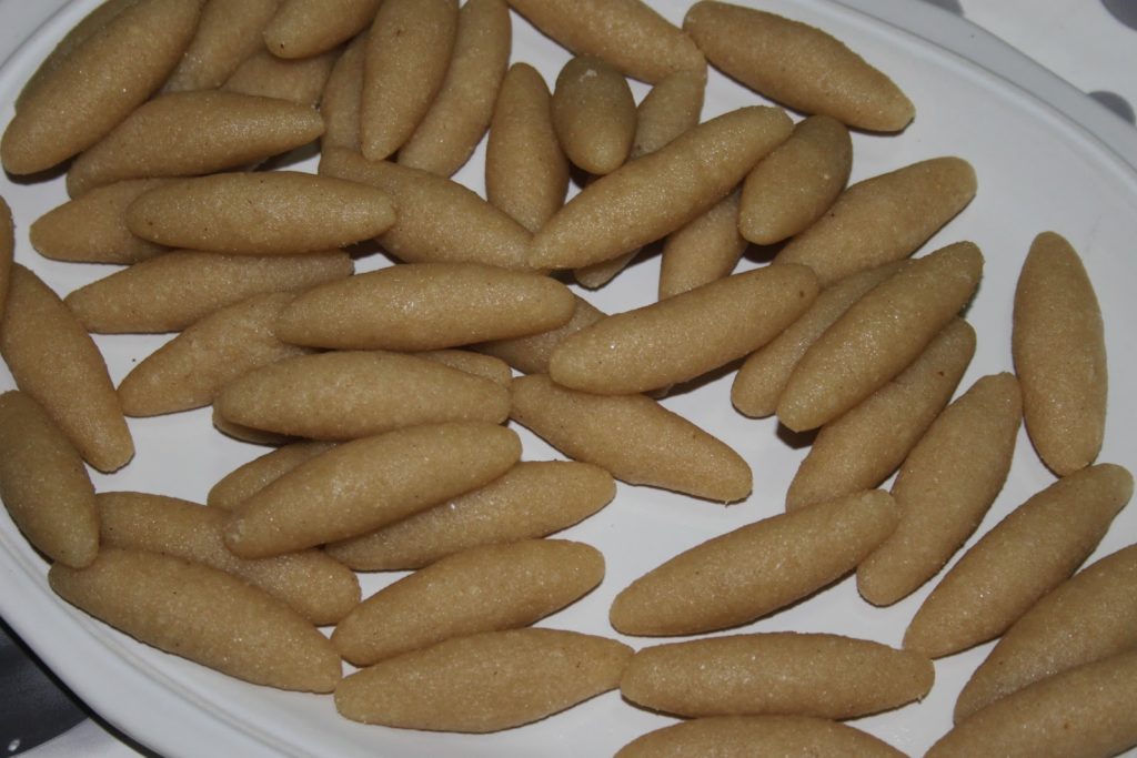 Il suffit ensuite de rouler les boulettes entre les paumes des deux mains trempées dans de l’eau de fleur d’oranger, pour obtenir ces petits boudins oblongs.