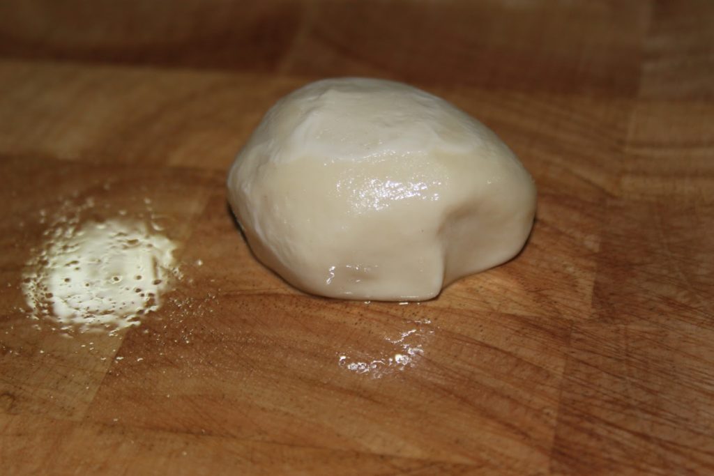 - Prendre une boule de pâte qui a reposé et huiler la surface de travail (un marbre ou mieux: une planche en bois, surtout du cèdre!). Huiler également un peu la boule.