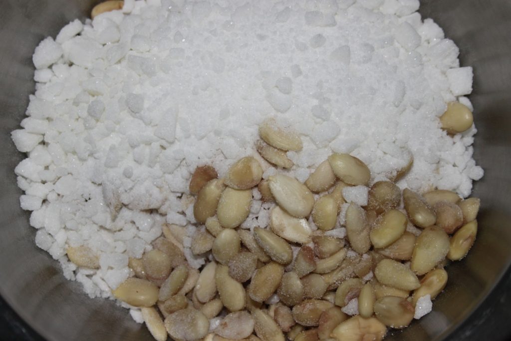 Mettre les amandes séchées, avec le sucre en morceaux, cassé au mortier.