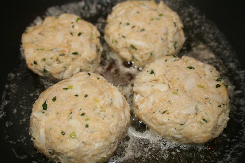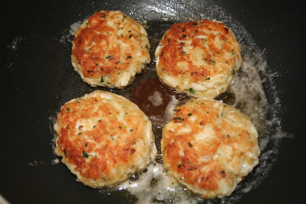 Mettre de l’huile et du beurre salé dans une poêle et chauffer. Quand le beurre crépite, ajouter les crabcakes aplatis.Conseil de Bernard: on peut tout à fait les passer à la chapelure pour une texture un peu plus croustillante sur le dessus. J’ai essayé les deux. On peut d’ailleurs trouver les deux aussi aux Etats-Unis…