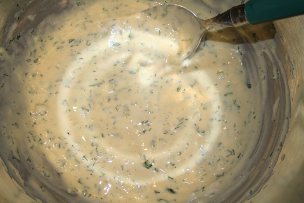 Mettre dans un bol l’oeuf, la mayonnaise, la moutarde, le persil plat haché et l’oignon hachée. Bien poivrer.