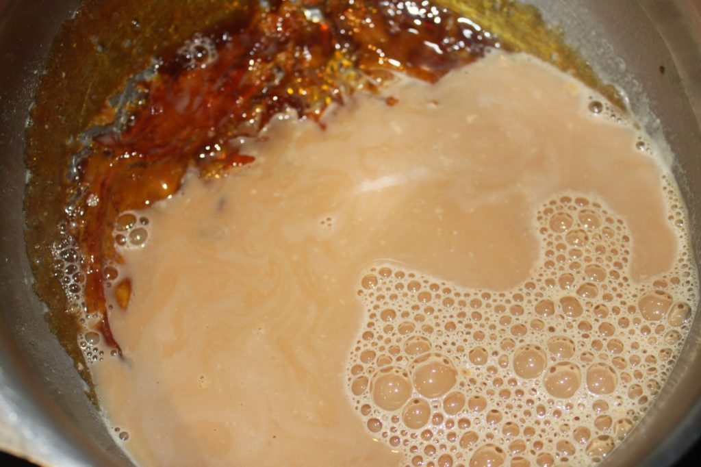 Quand les 120g de sucre sont caramélisés, versez le lait. Laissez ensuite chauffer très doucement pour que tout le caramel fonde dans le lait.