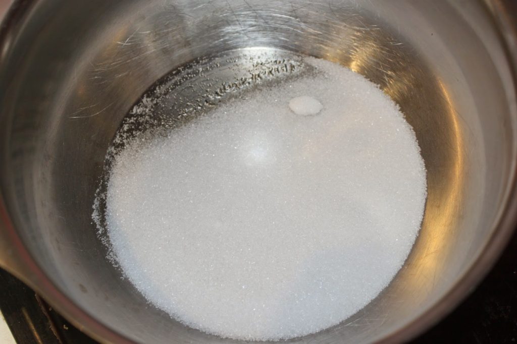 - Préparez tout d’abord le caramel à sec. Versez une petite partie des 120g de sucre dans une casserole sur feu moyen.