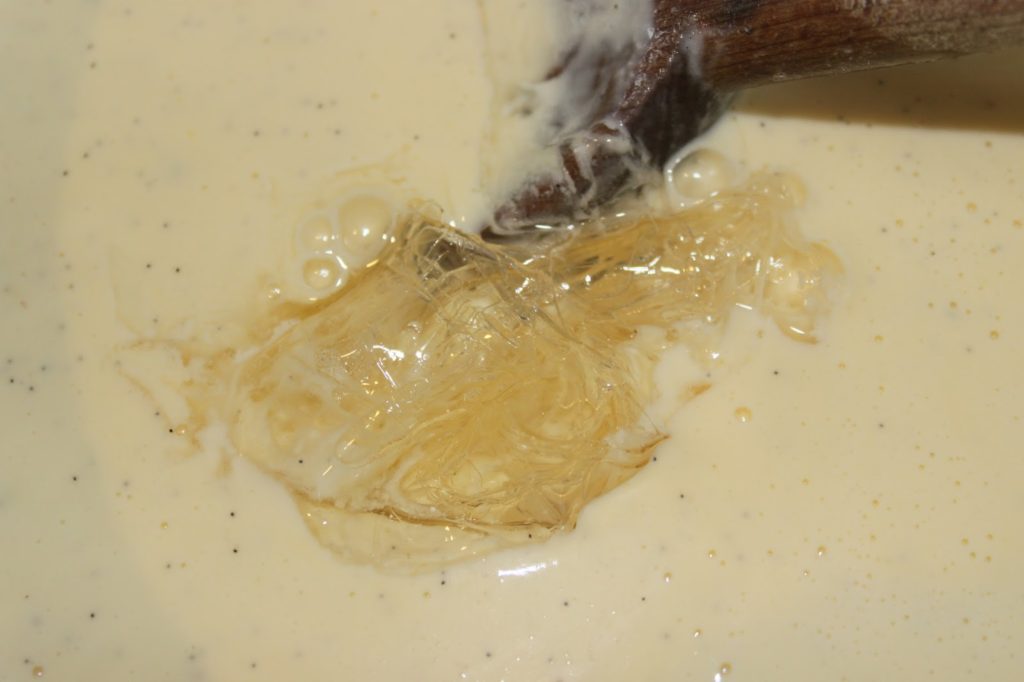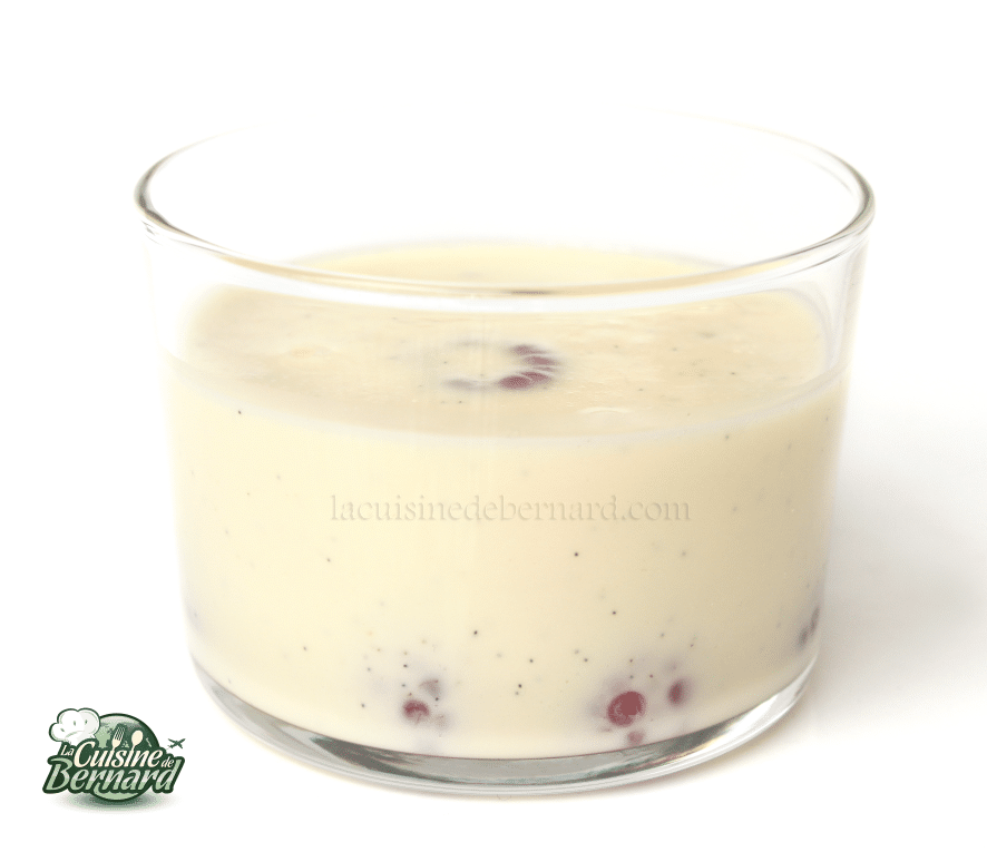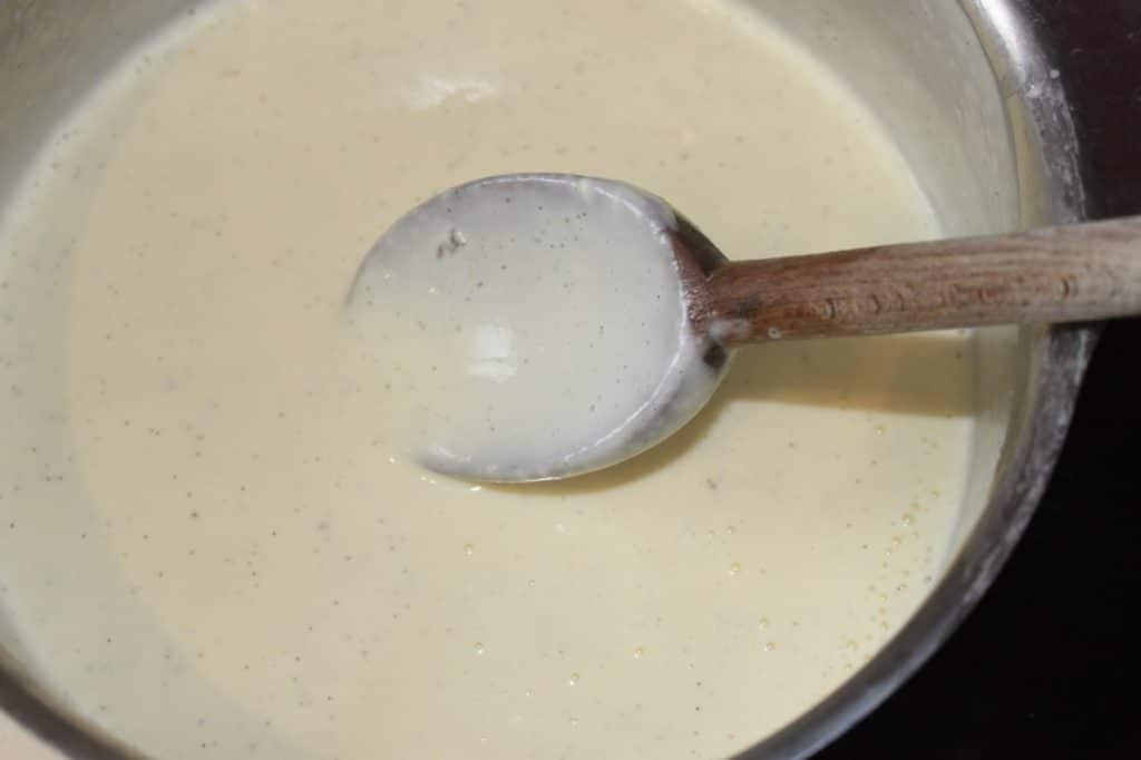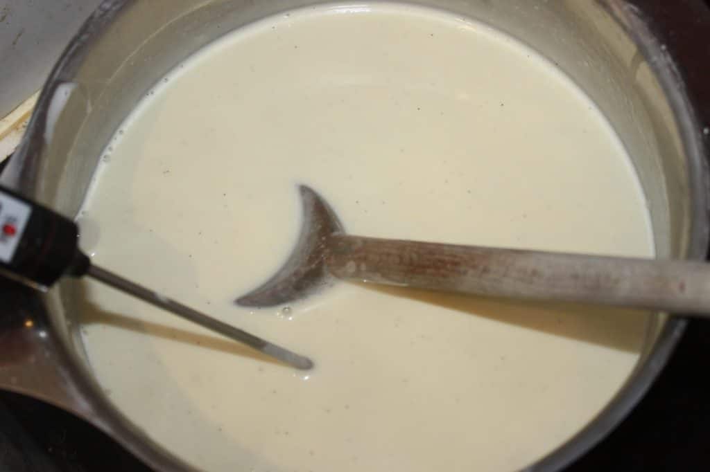 - Reversez le tout dans la casserole sur feu doux et tout en mélangeant, portez le tout à 88°C. C’est donc une crème anglaise que vous faites, simplement beaucoup moins sucrée.