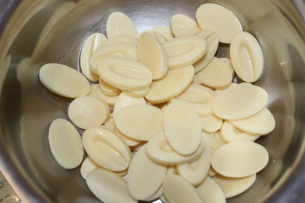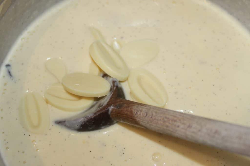 - Puis le chocolat blanc. J’ai utilisé de la couverture Ivoire de valrhona.