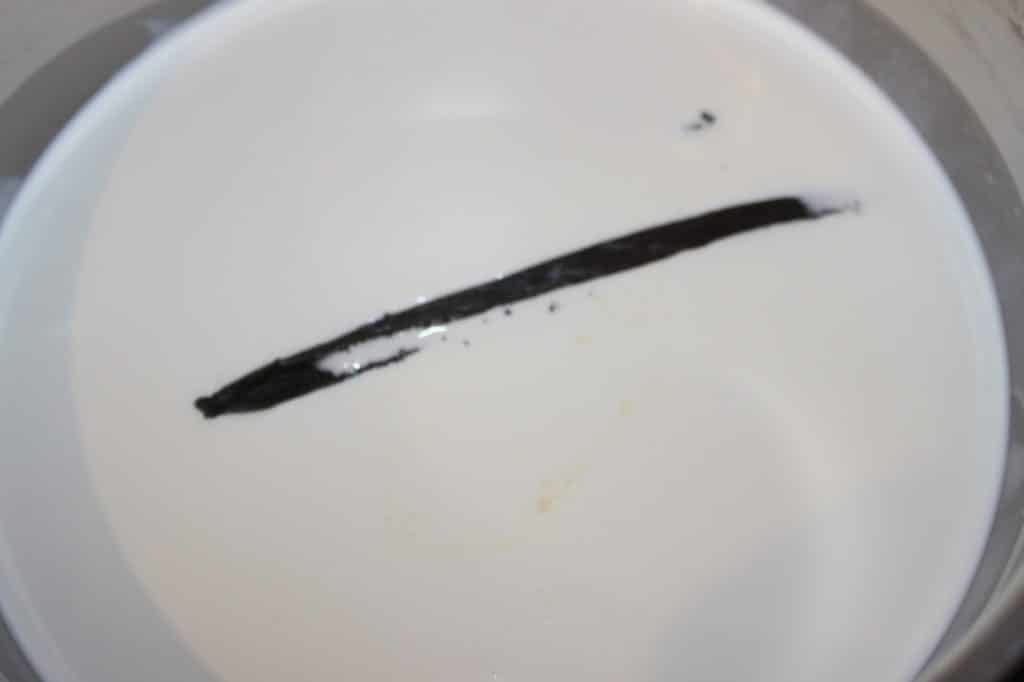 - Pendant ce temps, portez sur feu doux à frémissement le lait, la gousse vidée, la crème et les 15g de sucre restants.