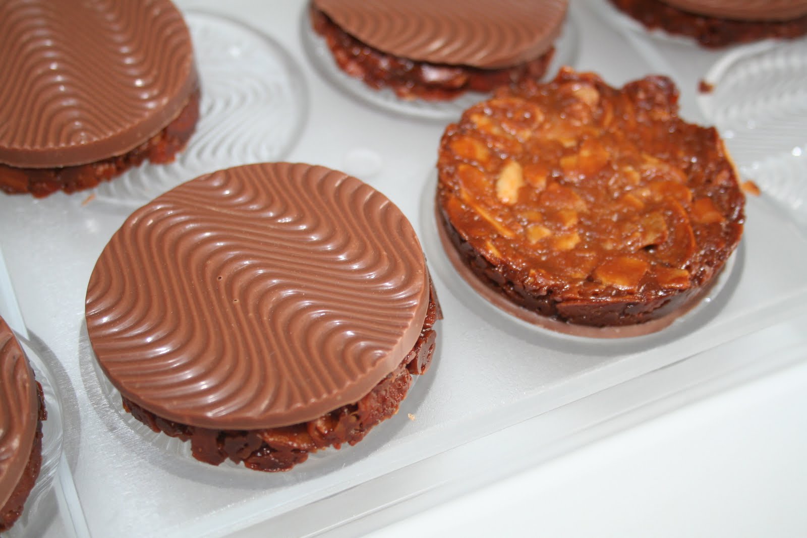 - Puis poser un croustillant délicatement sur le chocolat pour qu’il s’étale juste sous sa surface.