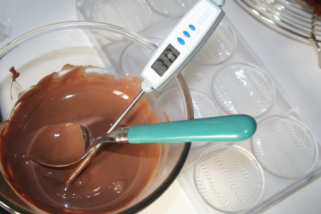 - Tempérer la couverture choisie (voir la méthode ici). J’utilise la méthode au beurre de cacao mycryo, plus pratique quand on n’a pas de trempeuse ou de table en marbre!!