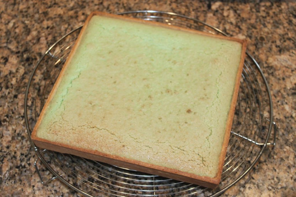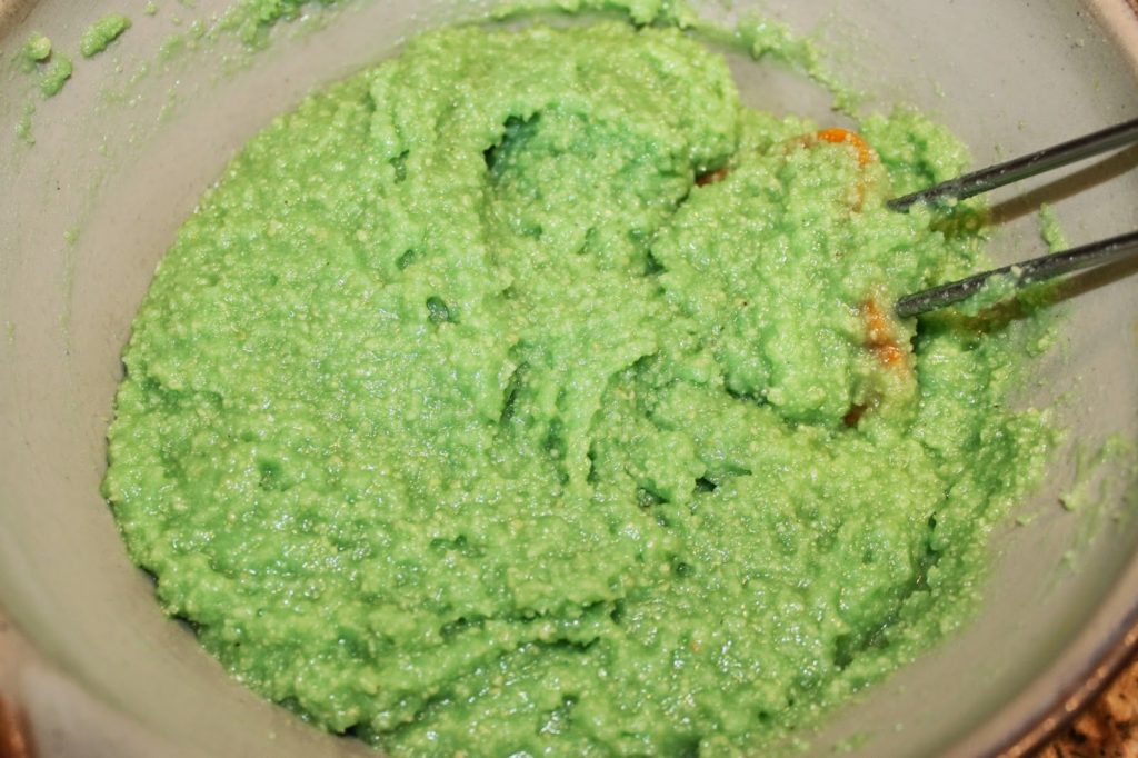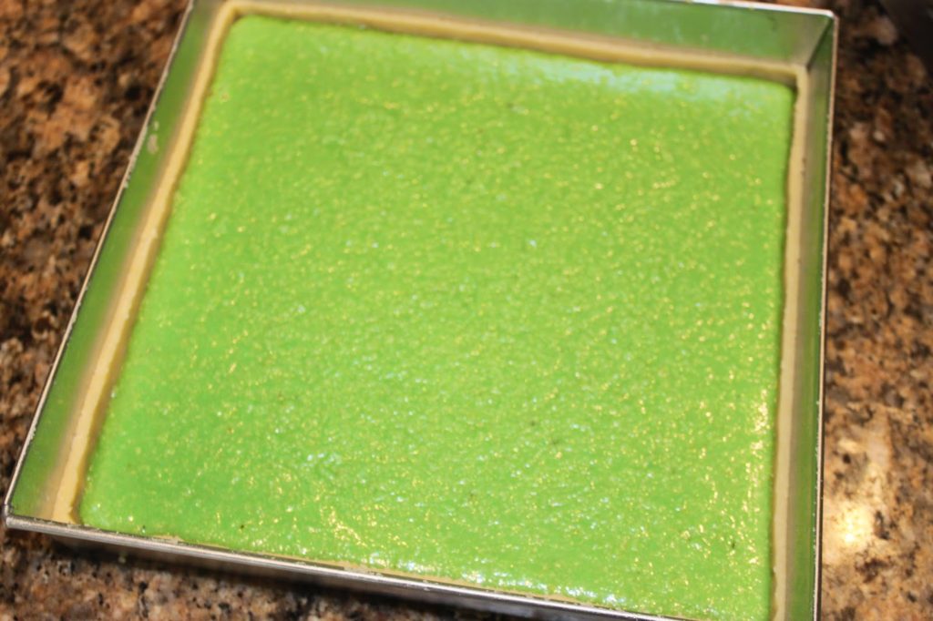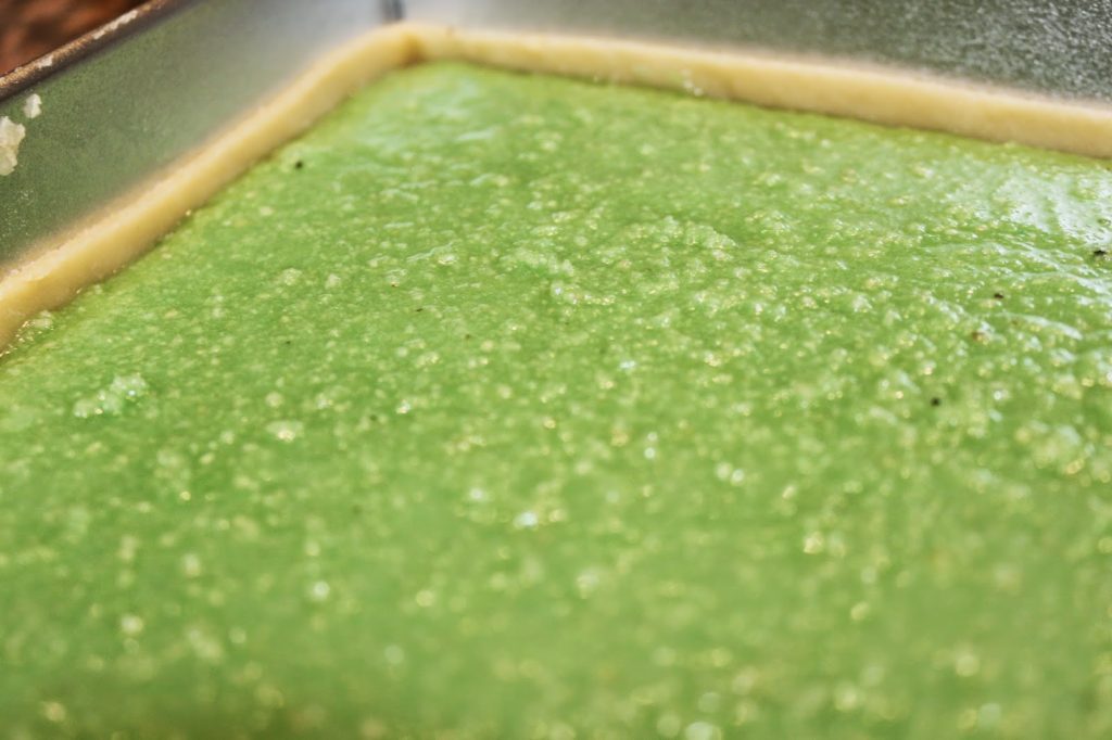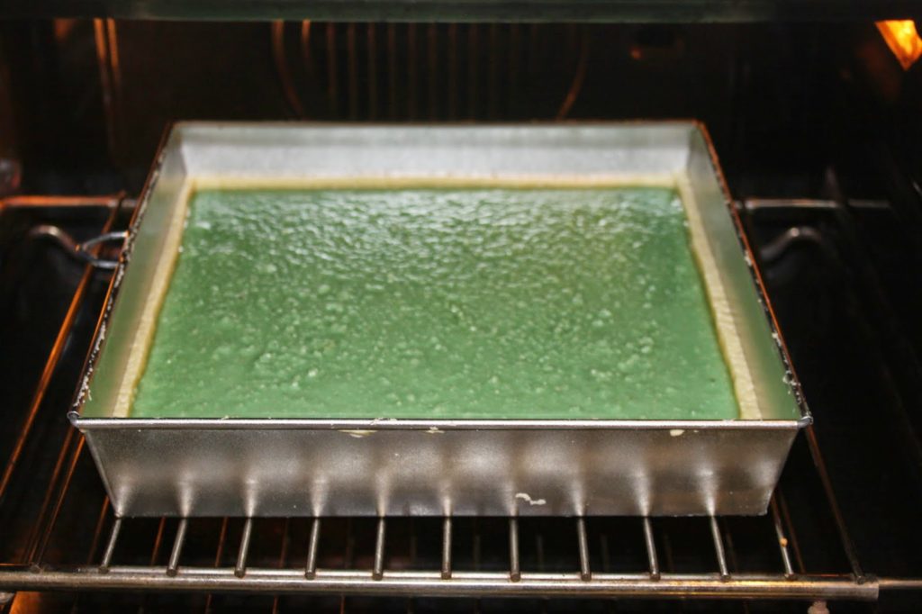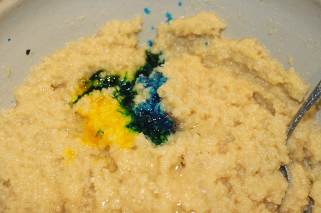 - Versez également le colorant vert. Celui-ci est facultatif évidemment, mais la croûte à thé est toujours curieusement verte ! J’ai mis du bleu et du jaune liquide, mais si vous avez un colorant vert en poudre, cela sera parfait !