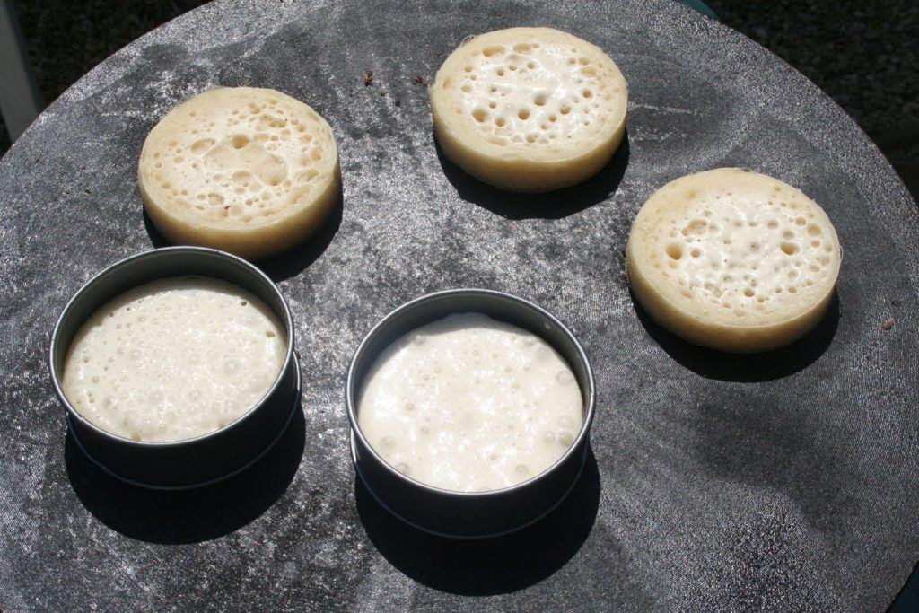 Ça m’a donné une excuse pour cuisiner dehors au soleil! J’ai mis le bilig sur 230°C. Poser les cercles à crumpets sur le bilig ou la poêle. Quand le bilig ou la poêle sont à température, verser une louché de pâte dans les cercles. La pâte doit arriver à environ 1 cm d’épaisseur, voir un peu plus!