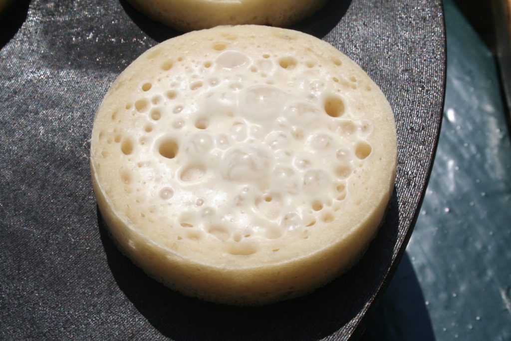 - La pâte va très rapidement se mettre à faire de grosses bulles. Pour avoir des trous dans les crumpets, j’ai découvert que lorsque la surface est presque cuite, il faut éclater les bulles en soulevant le crumpet et en le faisant tomber d’un coup sec à la verticale. Les bulles explosent alors et laissent place à des trous! On peut décercler dès que le pourtour est cuit. Ça laisse la place pour d’autres crumpets. Bien graisser à chaque fois les cercles.