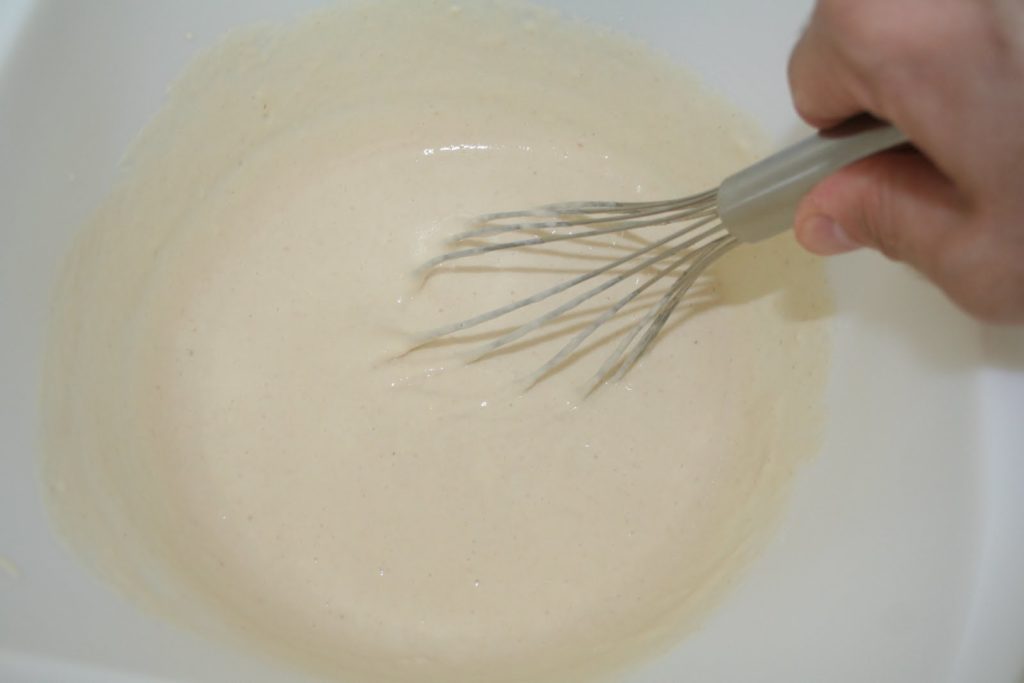 - Au bout de 10 minutes, ajouter le reste de l’eau (310ml) et la farine d’un coup. Mélanger vivement avec un fouet pendant au moins deux minutes.