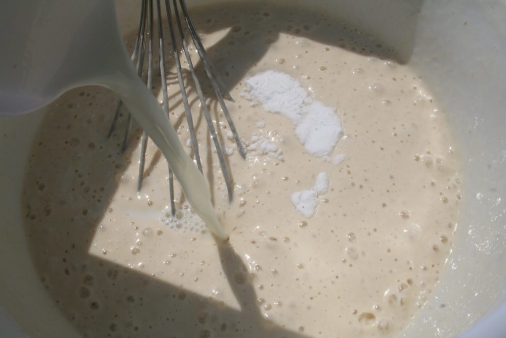 - Ajouter le lait tiédi et le bicarbonate de soude.