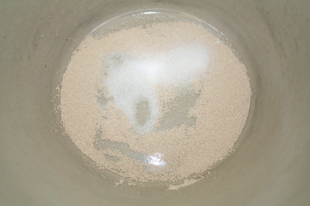 - Commencer par verser la levure et le sucre dans un grand bol.