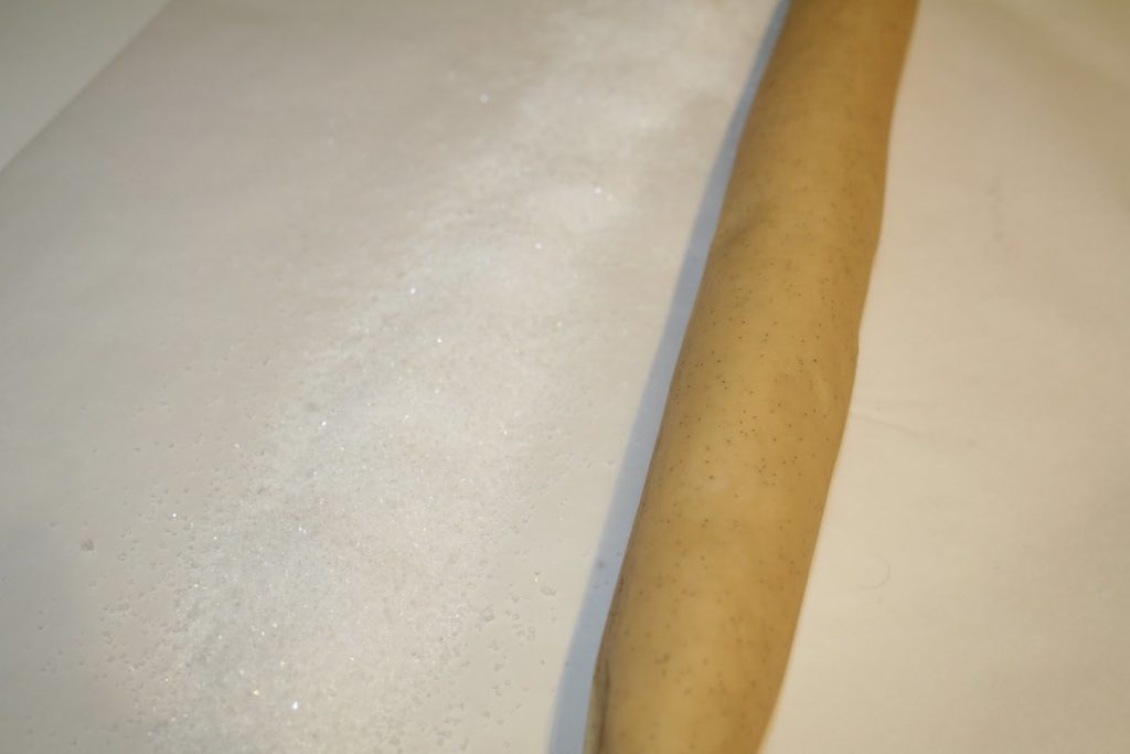 - Dans le cas contraire, laisser reposer la pâte au frais 30 minutes, puis la sortir 10 min avant de l’utiliser. De cette façon, elle sera ferme à l’intérieur, mais un peu plus malléable à l’extérieur. C’est ce que l’on souhaite, car la pâte est enrobée de sucre cristal. Préchauffer le four à 200°C.Disposer du sucre cristal sur le plan de travail. Je le fais sur un papier sulfurisé.