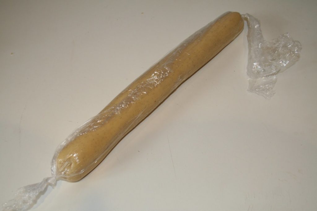 Former la pâte en 2 boudins de 3 cm de diamètre, et les envelopper dans du film étirable. On peut tout à fait congeler ces boudins, ou un seul des deux à ce moment.