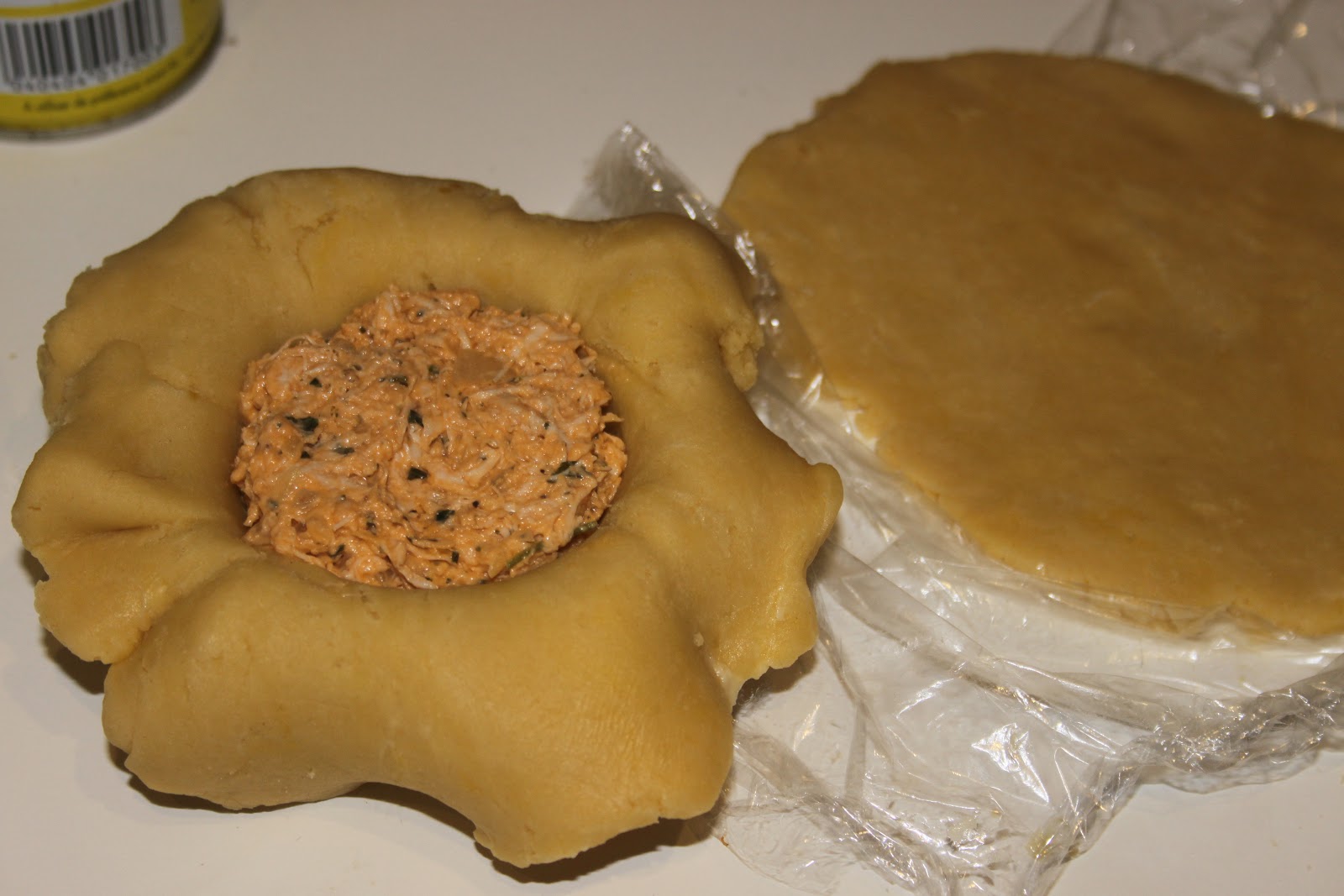 Étaler la pâte rapidement sur un plan de travail. Le plus facile est d’étaler la pâte sur un papier sulfurisé (sur la photo, c’est du film étirable, archi pas pratique!! Mais je n’avais plus de papier pour la photo!). Remplir un petit moule préalablement graissé avec une première couche de pâte en la faisant bien dépasser. Remplir avec la farce.