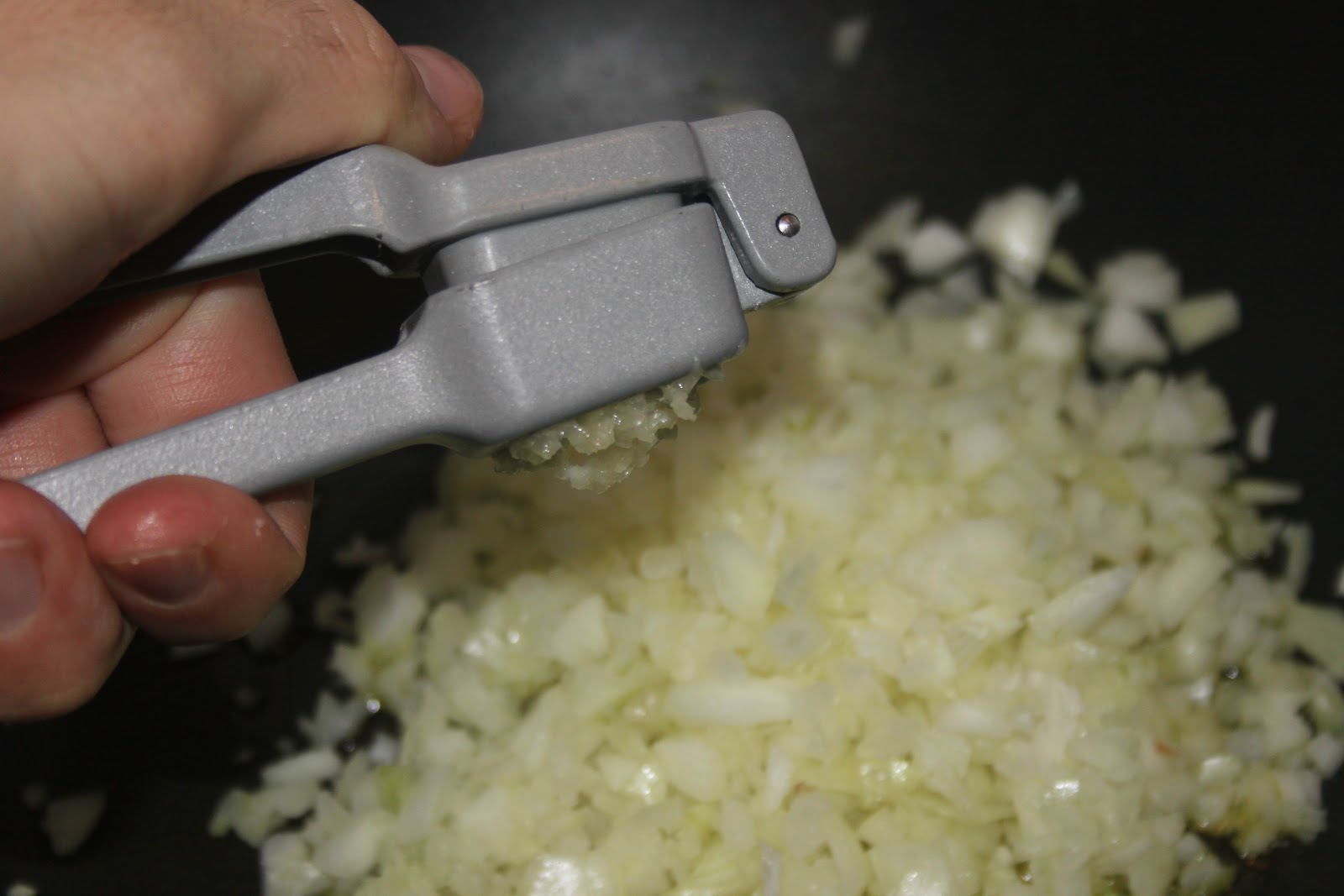 - Mettre l’oignon à cuire dans un large poêle avec les deux cuillerées à soupe d’huile. Ajouter l’ail écrasé.