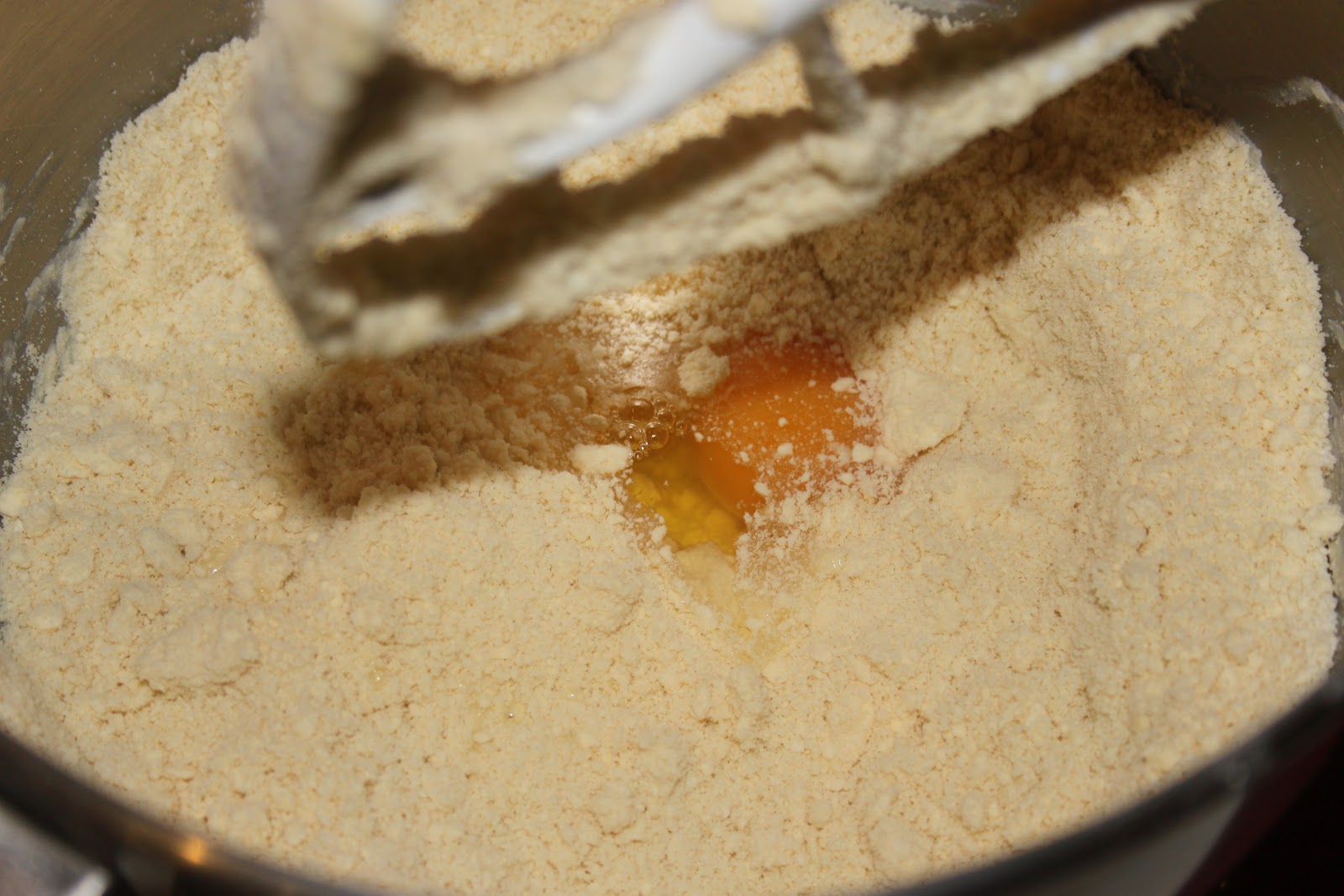 Bien mélanger pour sabler. Si le beurre s’agglomère trop vite, pas de souci! Ajouter l’œuf.