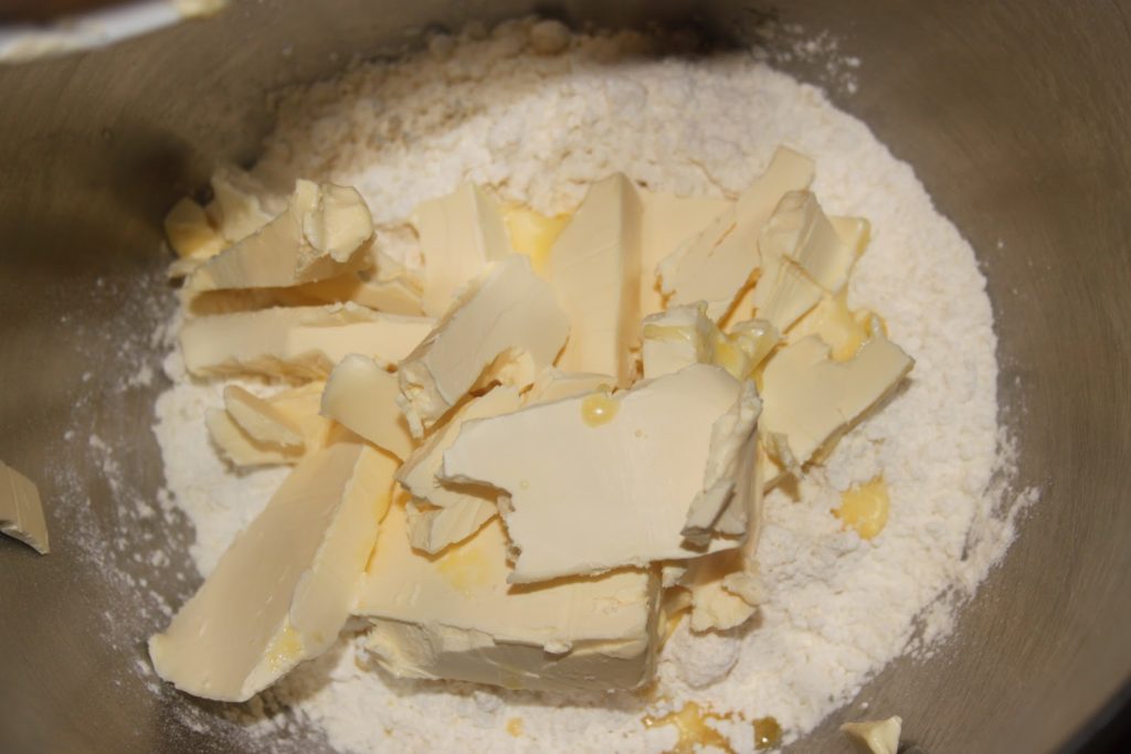 - Laisser refroidir la farce et préparer, en attendant, la pâte. Mettre la farine et le beurre à température dans un bol.