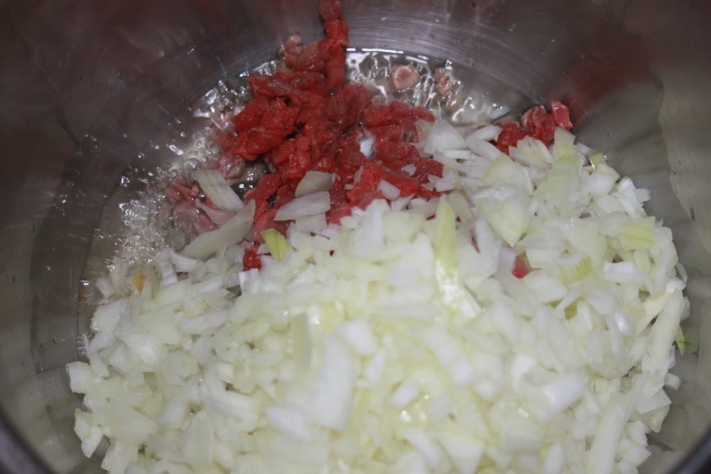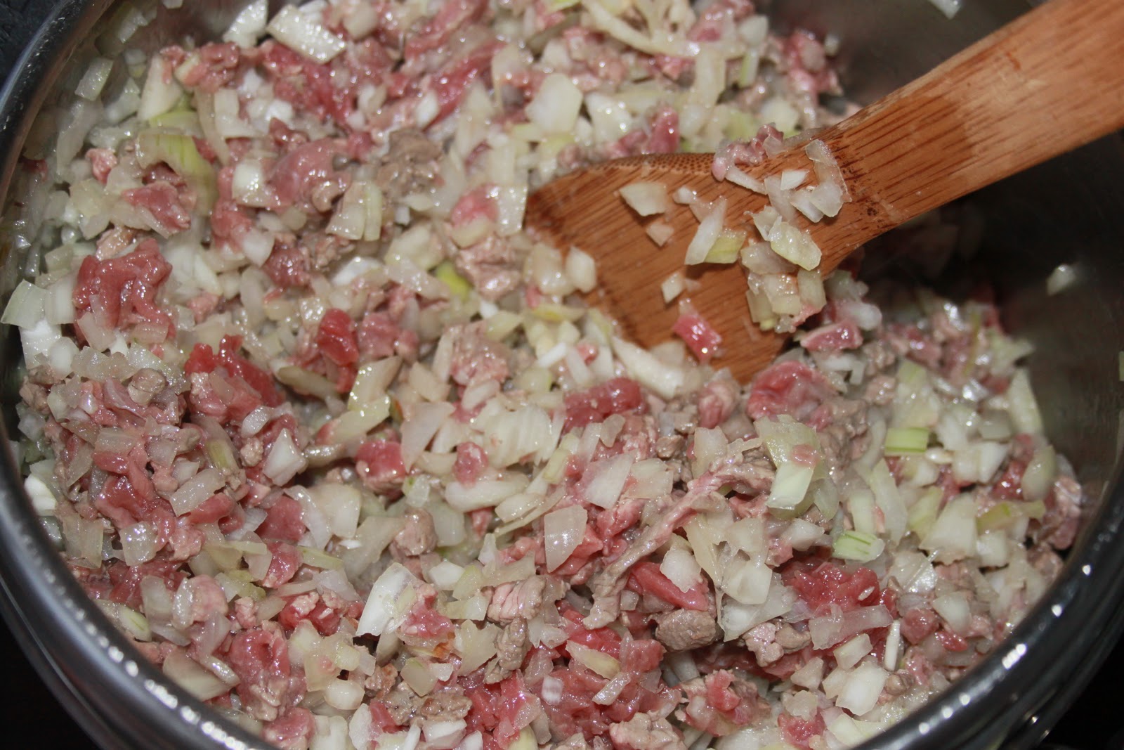 - Mettre le saindoux à fondre dans une grande casserole sur feu moyen. Ajouter le boeuf.
